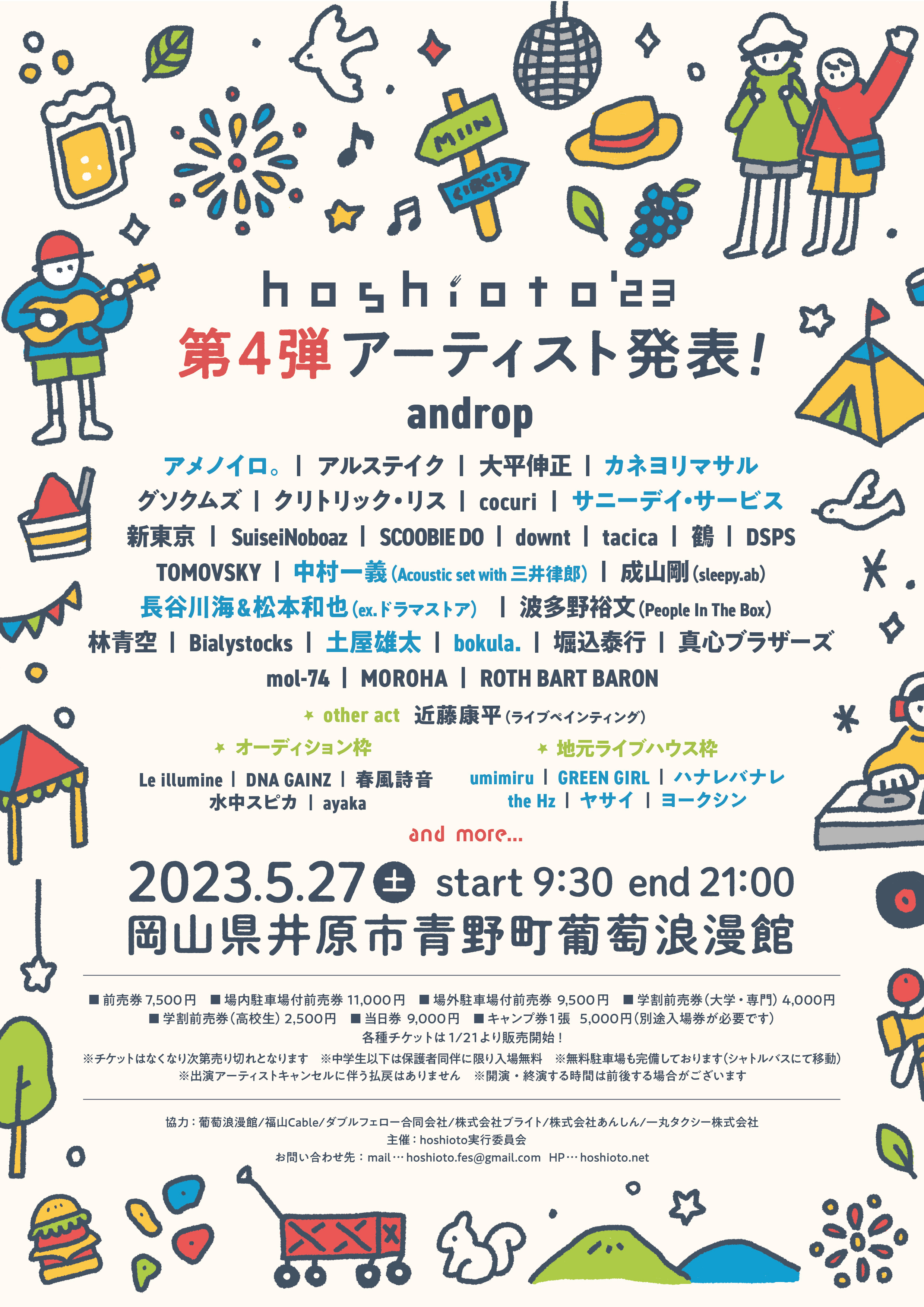 10回目となる岡山の野外フェスティバル『hoshioto'23』の第4弾アーティスト発表が行われた。