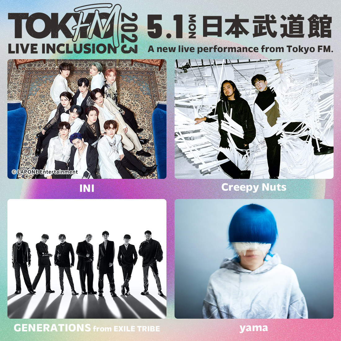 5月1日に開催が決定した『TOKYO FM LIVE INCLUSION 2023』の出演は、TOKYO FM/JFN『From INI』が放送中のINI、R-指定とDJ松永の2人によるヒップホップユニット・Creepy Nuts、メンバーの小森隼がTOKYO FM/JFN『SCHOOL OF LOCK!』でパーソナリティをつとめている7人組ダンス&ボーカルグループ・GENERATIONS、SNSを中心にネット上で注目を集め、オリジナル楽曲「春を告げる」がストリーミングの累計再生回数3億回を突破した、新世代シンガー・yamaの4組。一夜限りのスペシャルな組み合わせのライブとなる。