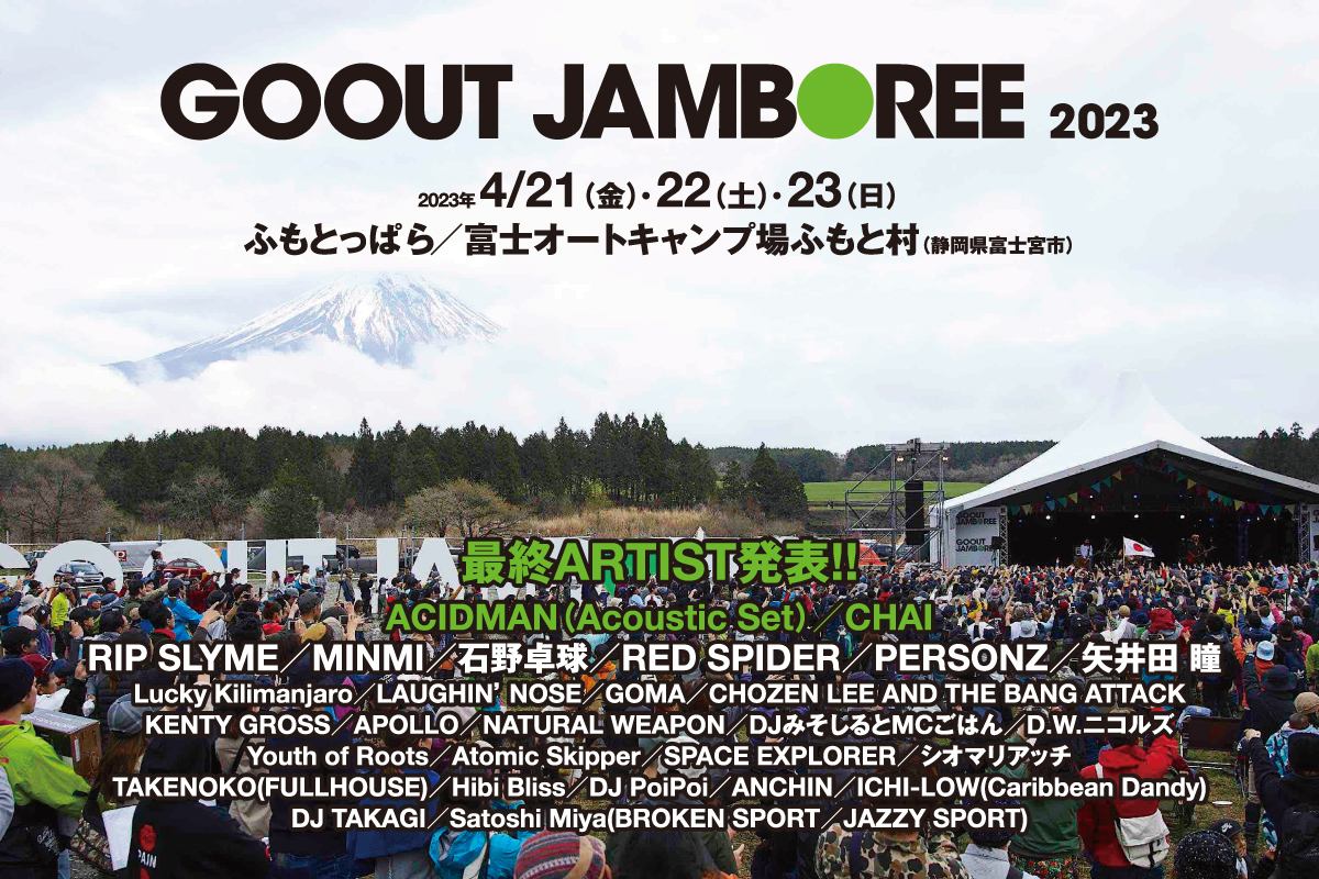 アウトドアファッション雑誌『GO OUT』が主催する、キャンプ初心者からソロ、カップル、ファミリーまで、誰もが楽しめるキャンプフェス『GO OUT JAMBOREE 2023』が、2023年4月21日(金)~4月23日(日)の3日間、 富士山の麓・ふもとっぱらにて4年ぶりに開催される。