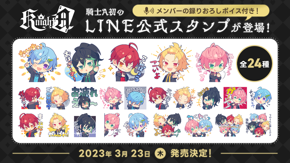 また、Knight A – 騎士A -初の公式LINEスタンプの販売が、3月23日(木)よりスタートすることが決定。LINEスタンプはメンバー撮りおろしボイス付きで、普段の彼らがよく発する言葉など全24種類がラインナップされている。