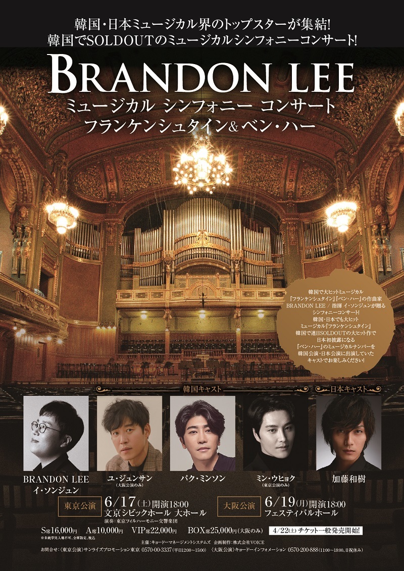 韓国・日本でも初演・再演と好評な『フランケンシュタイン』、韓国で連日SOLDOUTの大ヒット作で日本初披露になる『ベン・ハー』のナンバーを韓国公演・日本公演に出演していたキャストで楽しめる『BRANDON LEE ミュージカル シンフォニー コンサート フランケンシュタイン&ベン・ハー』は、6月17日(土)東京・文京シビックホール、6月19日(月)大阪・フェスティバルホールにて開催。