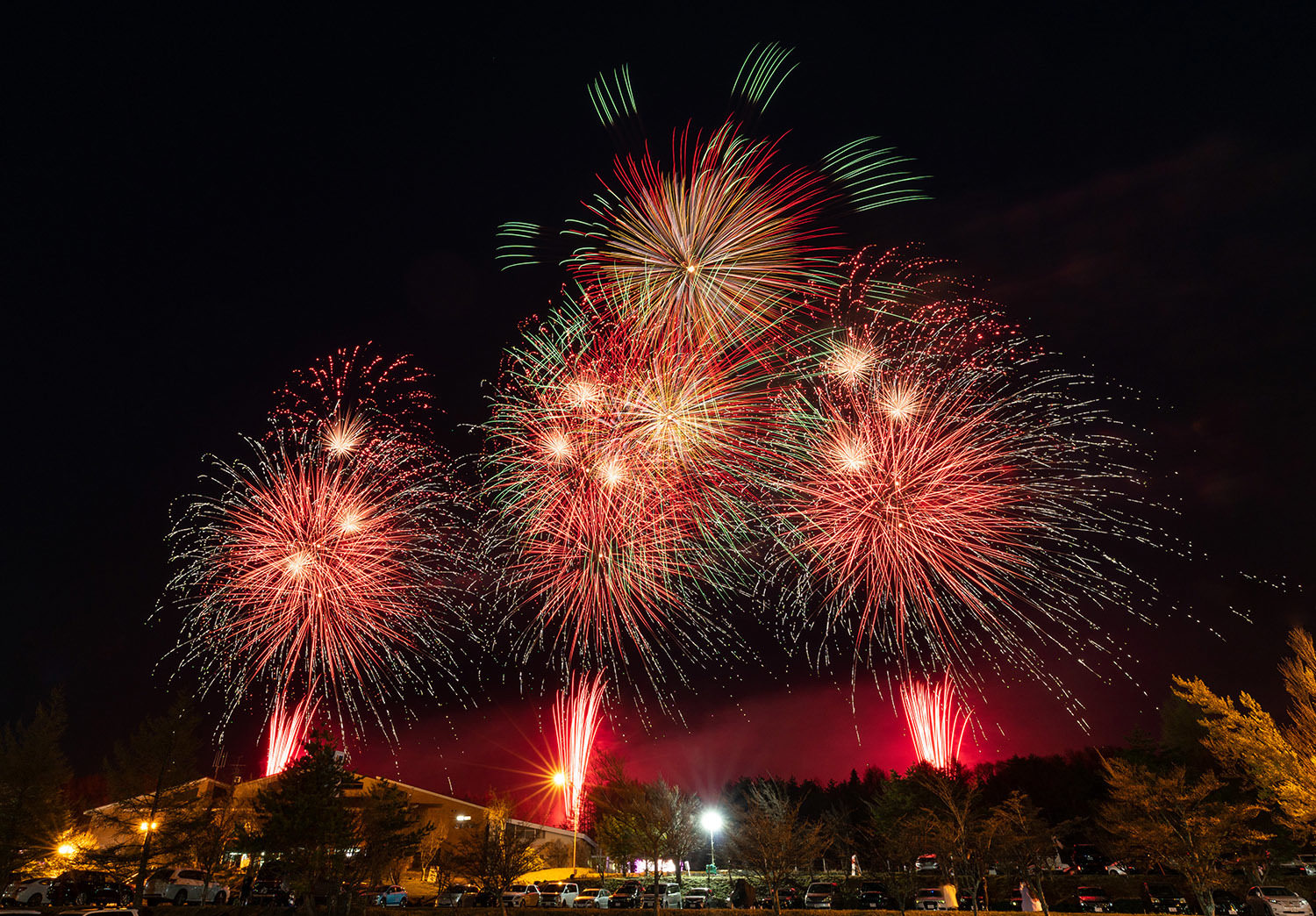 実行委員:富士山が近くて、会場にロッヂがあって反響するので、反響音が凄くきれいだと思います。打ち上げ場所から観客席まで遮るものがなくて、ダイレクトに花火の衝撃波を感じることもことができます。花火大会というと海や川、湖での開催が多いので、花火が水平に上がるのが当たり前でした。でもこの大会はスキー場で斜面になっているので、花火が降ってくる感じがしますが、山の花火では火事に最新の注意を払っています。消火用のドローンをいち早く導入しました。