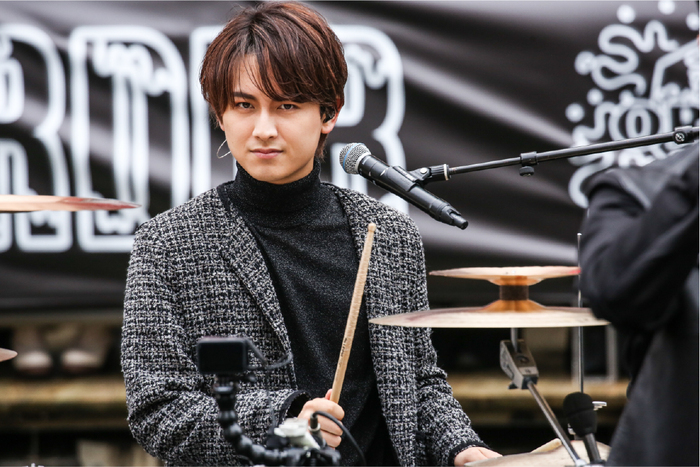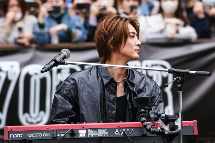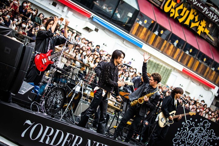 7ORDERが乗った船が大阪ミナミのランドマークとも言えるグリコの看板を横目に道頓堀川に登場し、大歓声の中、川沿いの遊歩道から戎橋の上まで360°に目線を送りエネルギッシュにアピール。安井謙太郎(Vo.Gt)も「初めましての人も、いつも来てくれている人も、短い時間ですが楽しんでいただけたら。すごくない? 雨予報だったのに雨降ってないよ!」と持ちこたえた天気に喜びを隠さない。