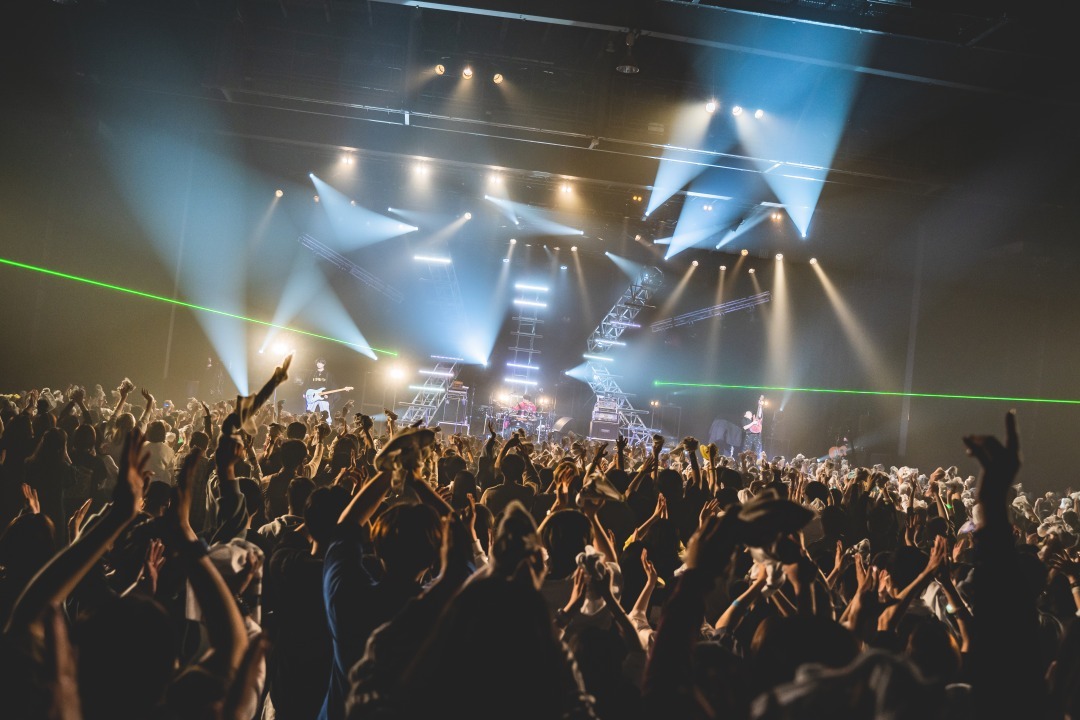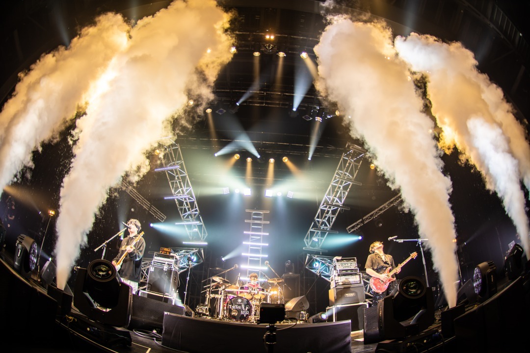 た「乱気流」、真っ直ぐなメッセージを届けた「BIRD WITHOUT」と続き、晴人の感傷的なハイトーンが胸を締め付ける「私面想歌」と続き、会場を自身の世界に染め上げた序盤戦。「最高だ! こんな大勢の人間を見たのは何年ぶりやろ?」と達也が感慨深そうに話して始まったMCは、ツアーの思い出を語り始めたと思ったら、それぞれが“怖い話”を好き勝手に話し始め、自由すぎる空気感と観客の笑いで会場を包む。このカッコいいと親しみやすいを併せ持った、ギャップや人間味の部分も彼らのライブの魅力なのだろう。