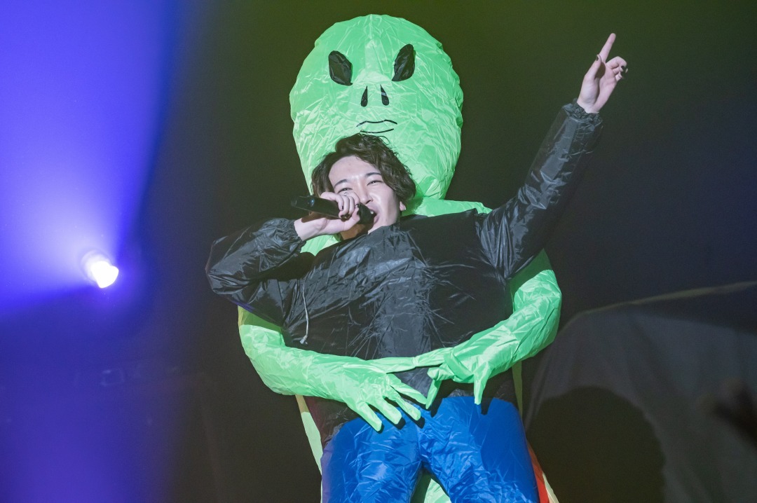 Non Stop Rabbitに関するクイズが出題され、一番答えられなかった人が罰ゲームを受けるというデスゲームのコーナー。圧倒的な強さを見せた大我に対し、全く答えられず完敗したのは達也。観客から悲鳴が上がった罰ゲームが遂行されると、3人がステージから去り、ライブは後半戦へ。突如始まった、“ハッピーな毎日を過ごしていた3人が、宇宙人に連れさられた”というナレーションから始まった楽曲は「豆知識」。宇宙人に抱かれた着ぐるみ姿で登場するや、ダンストラックに乗せてハンドマイクで歌い踊り、フロアを沸かせる晴人と達也。曲中に金の全身タイツで登場した大我は指揮棒を振り、観客は手振りを合わせて大はしゃぎ。着替えタイムを挟んで、3人が再び楽器を背負って仕切り直すと、「偏見じゃん」でライブを再開。いわゆるネタ要素の強い曲だが、ポップな曲調とキャッチーなメロディに観客が飛び跳ね、フロアを熱狂させる。
