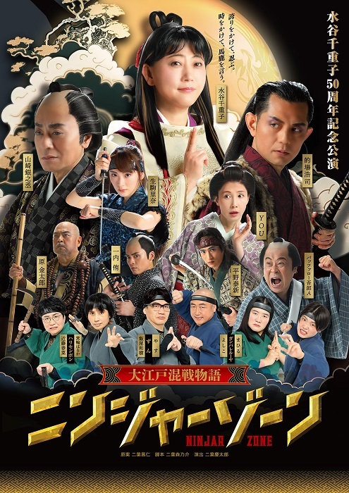 お芝居ステージのタイトルは「大江戸混戦物語 ニンジャーゾーン」。既報のとおり、前回公演に続き、生駒里奈、バッファロー吾郎A、YOUだけでなく、水谷千重子座長公演初登場となる的場浩司、山崎銀之丞、原金太郎、一内侑、平野泰新、芸人キャストは、ずん・ハリセンボン・ガンバレルーヤ(トリプルキャスト・日替わり出演)が華を添える。
