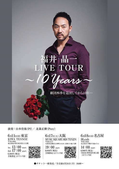 ミュージカル俳優、福井晶一が、劇団四季を退団してから10年の節目に感謝の気持ちを込めて、ライブ『福井晶一LIVE TOUR 〜10 Years〜』を東京、大阪、名古屋で開催する。