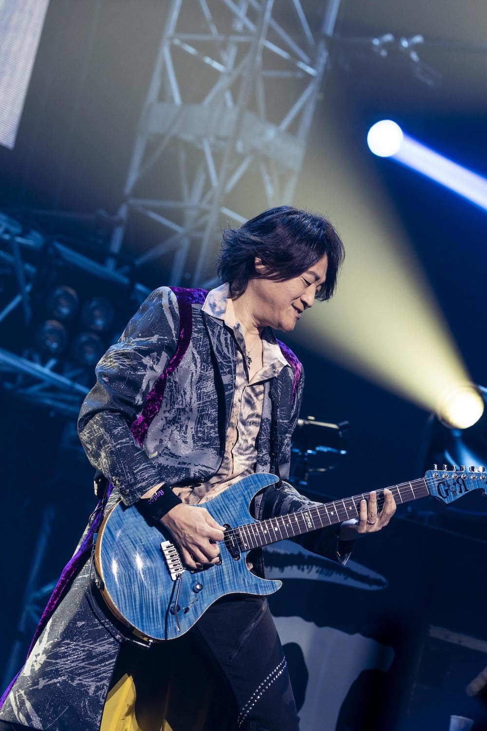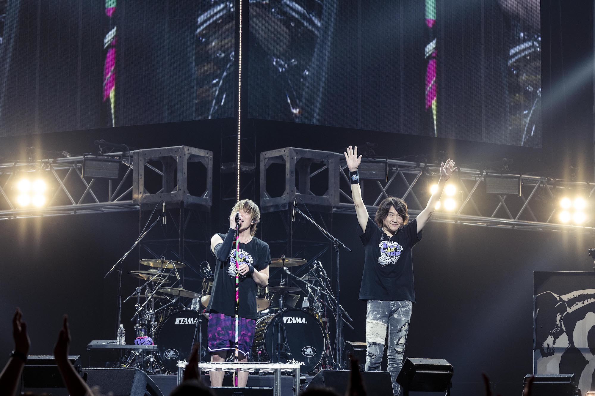 そんな新たな興奮の中、アンコールに届けられたのは、彼らのライブアンセムのひとつ「modern strange cowboy」。華々しいアウトロが終わり、これでアニメタイアップ全32曲をついに完走だ!と思われたその時。SHiNのドラムが聞き覚えのあるリズムを刻み、KISHOWが「Go For It! Go For It!」と声を重ね、e-ZUKAがおなじみのリフを弾き始める。オープニングナンバーだった「Go For It!」で残されていた「I.G.P.X」のコール&レスポンスを、最後のお楽しみとして取っておいてくれたのだ。10回以上のコールを重ね、ラストはKISHOWがe-ZUKAと肩を組んでマイクを分け合う場面も! 空気を切り裂くKISHOWの“Rock You!”のシャウトが、日本武道館の隅々まで響き渡った。