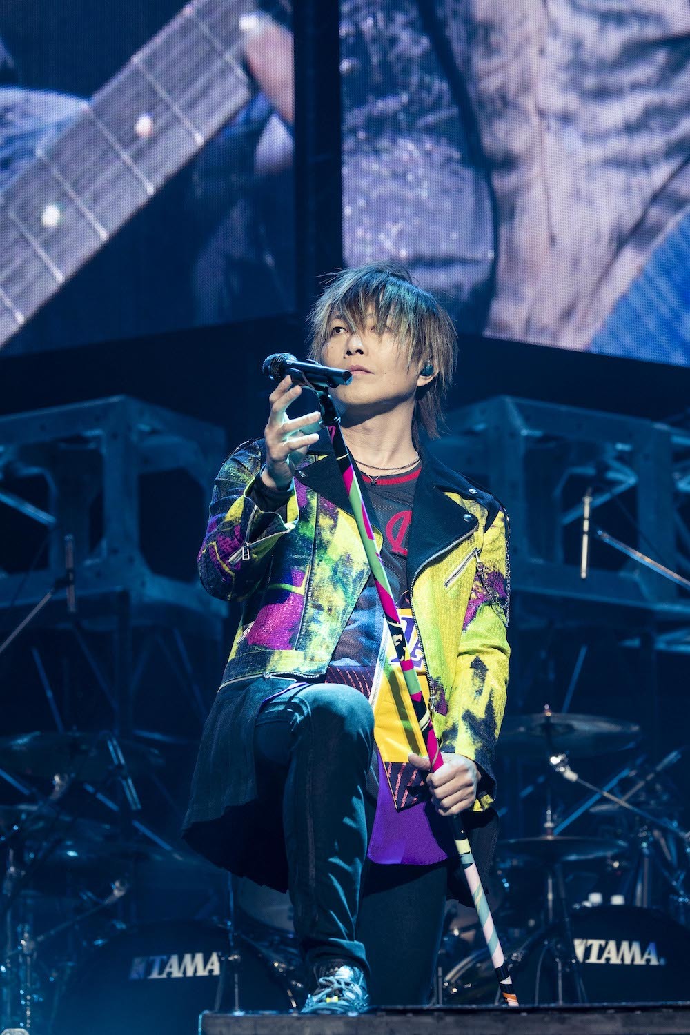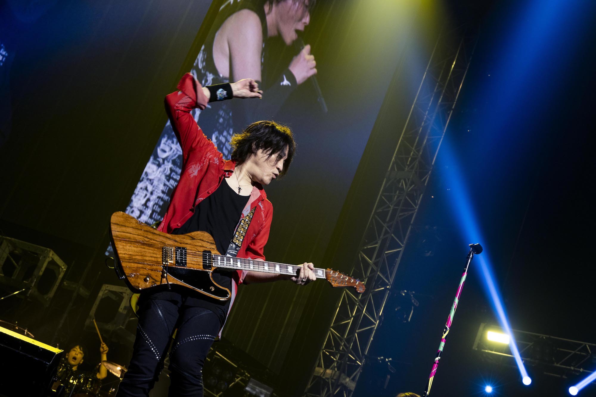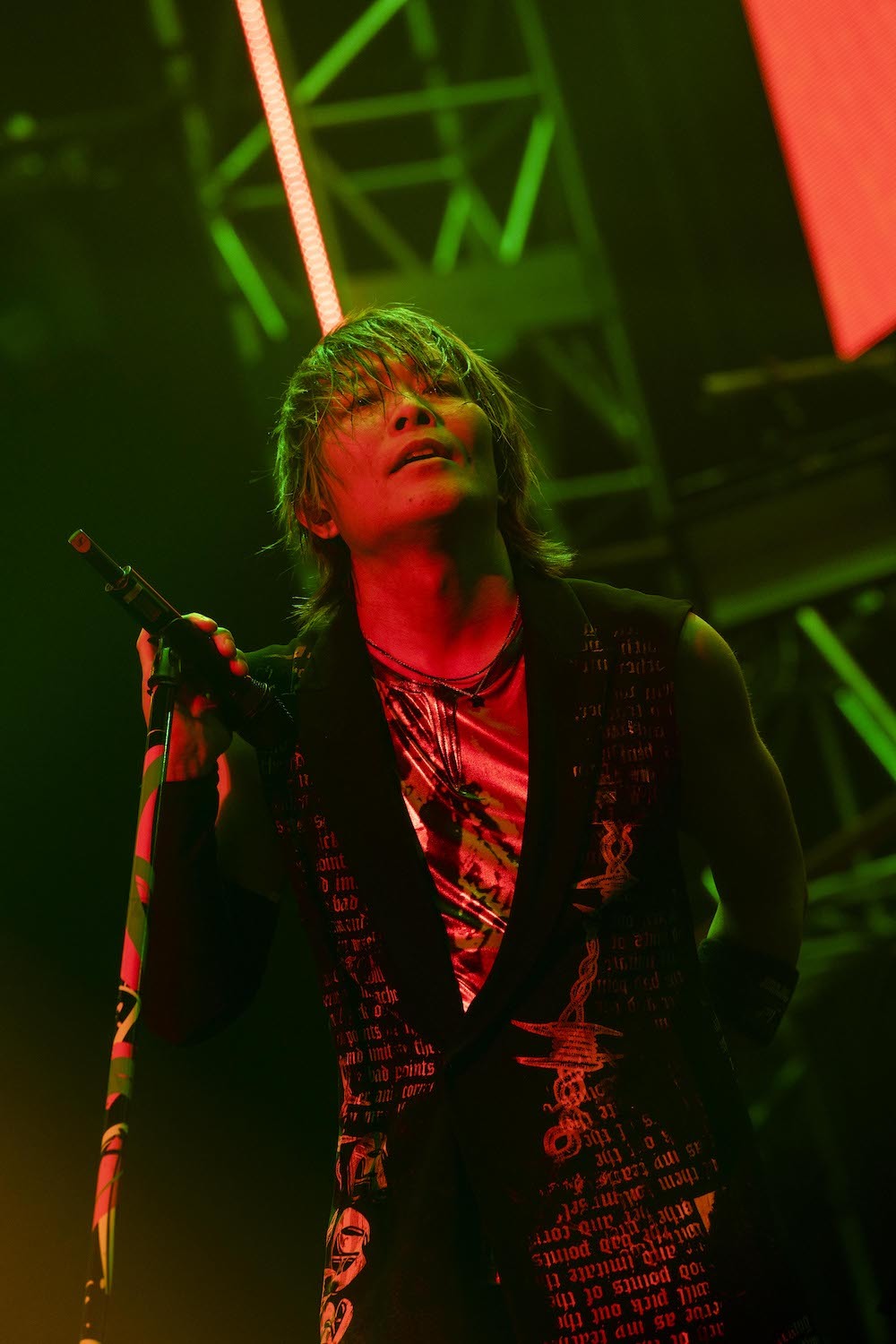 沸き立つ熱を一度冷ますように、クールなBGMと共にLEDビジョンには雄大な銀河系が映し出される。そしてスケールの大きな宇宙を眼前にした武道館に響いたのは、この日のセットリスト中、唯一のミドルチューン、TVアニメ『機動戦士ガンダム 鉄血のオルフェンズ』第2期EDテーマ「少年の果て」。その壮大な静けさから、波打つジェットコースターは再びギアを上げて昇り出す。ダンサブルな「DARK SHAME」、激しく狂おしいラブソング「偏愛の輪舞曲」でスピードを上げ、『最遊記RELOAD』シリーズの2曲「move on! イバラミチ」と「カミモホトケモ」で、KISHOWが華やかな扇子を振りながらオーディエンスを煽る。