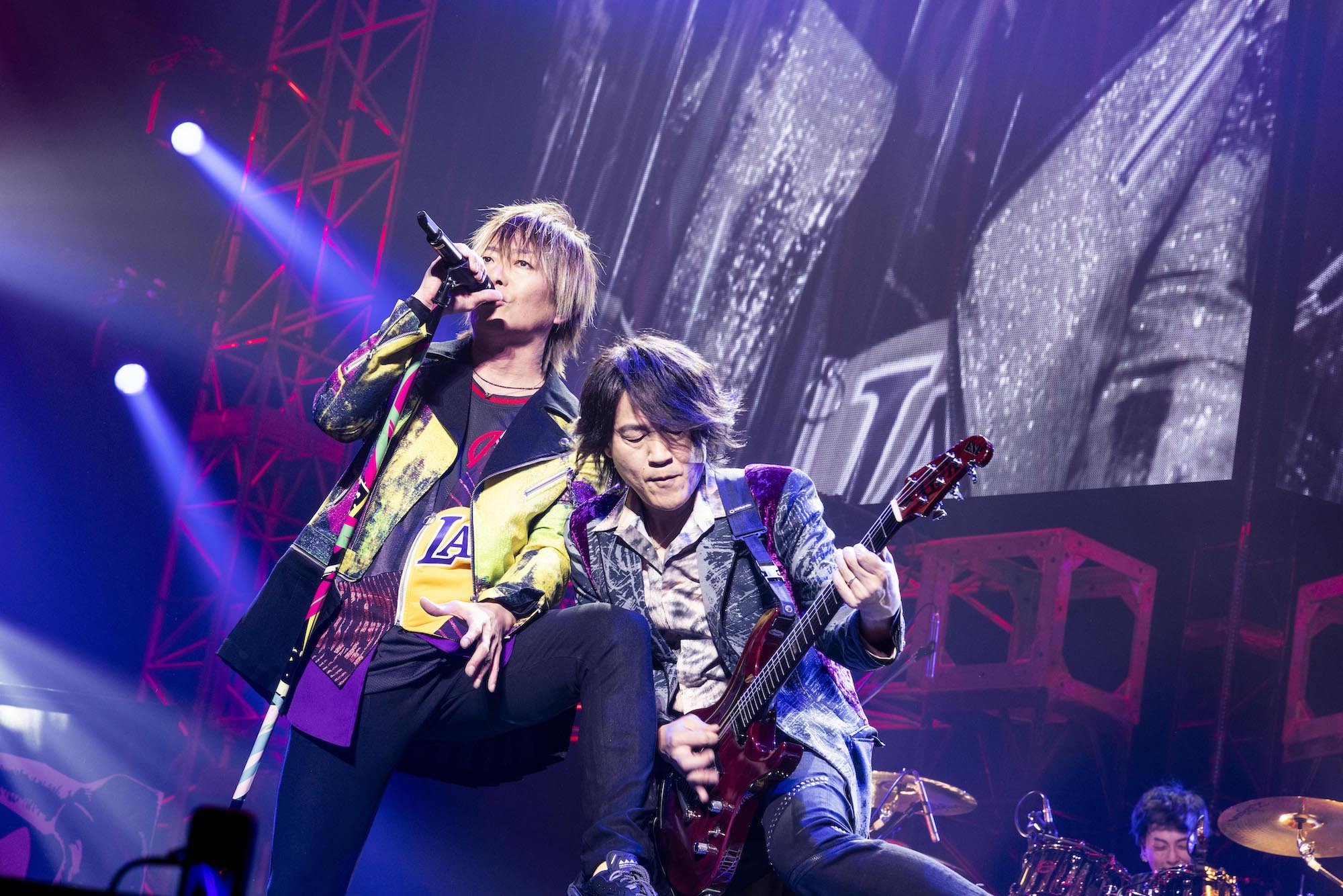 だが、そんな時間も束の間だ。KISHOWが「ここからは、GRANRODEOを押し上げてくれた作品群をやっていきたいんですが、その前にもうすぐ出る新曲を。今日“ヤツ”(小野賢章)はおりませんが、歌ってみたいと思います」と告げたのは、まだCDリリース前だった『黒子のバスケ』アニメ10周年記念アニバーサリーソング「ゼロステップ」だ。GRANRODEOと『黒子のバスケ』の蜜月の出発点となった「Can Do」を彷彿とさせる明るくスポーティーな「ゼロステップ」は、タイトルのイメージ通り原点回帰を感じさせる1曲。KISHOWの艶のあるブライトなボーカルは、シングルに“feat.小野賢章”名義で収録された小野賢章とのデュエットバージョンとはまた違う、のびのびとした軽快な魅力をたたえていた。