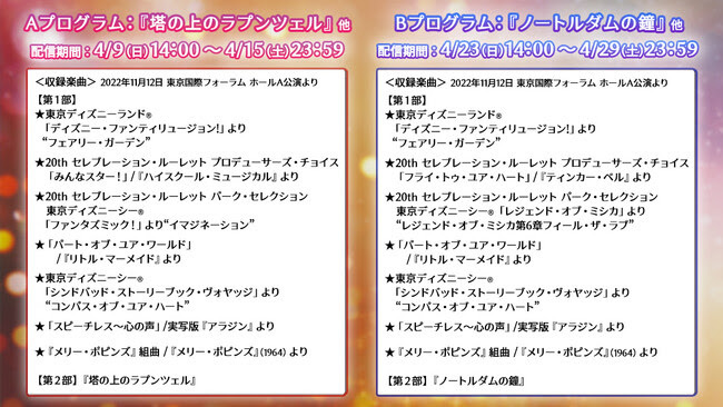 20周年を迎えた昨年は、3年ぶりに来日キャストを迎え、全国37都市を巡り、全54公演のツアーを完走した。 アニバーサリーイヤーを飾った2つのメイン演目は『塔の上のラプンツェル』と『ノートルダムの鐘』。そのほか、お客様からのリクエストが多かった楽曲など、全72曲を収録した2公演分の映像配信が行われる。配信期間中は、何度でも視聴可能。本日3月31日(金)より配信チケットの販売がスタートした。