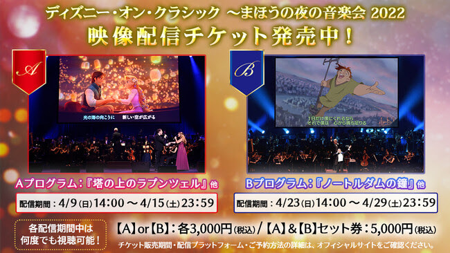 ディズニー・アニメーションや映画、 テーマパークの音楽を、 オーケストラとヴォーカリストの生演奏で届ける『ディズニー・オン・クラシック ~まほうの夜の音楽会』。昨年2022年に3年ぶりに来日キャストを迎え行われた『ディズニー・オン・クラシック ~まほうの夜の音楽会 2022』の映像配信が決定した。