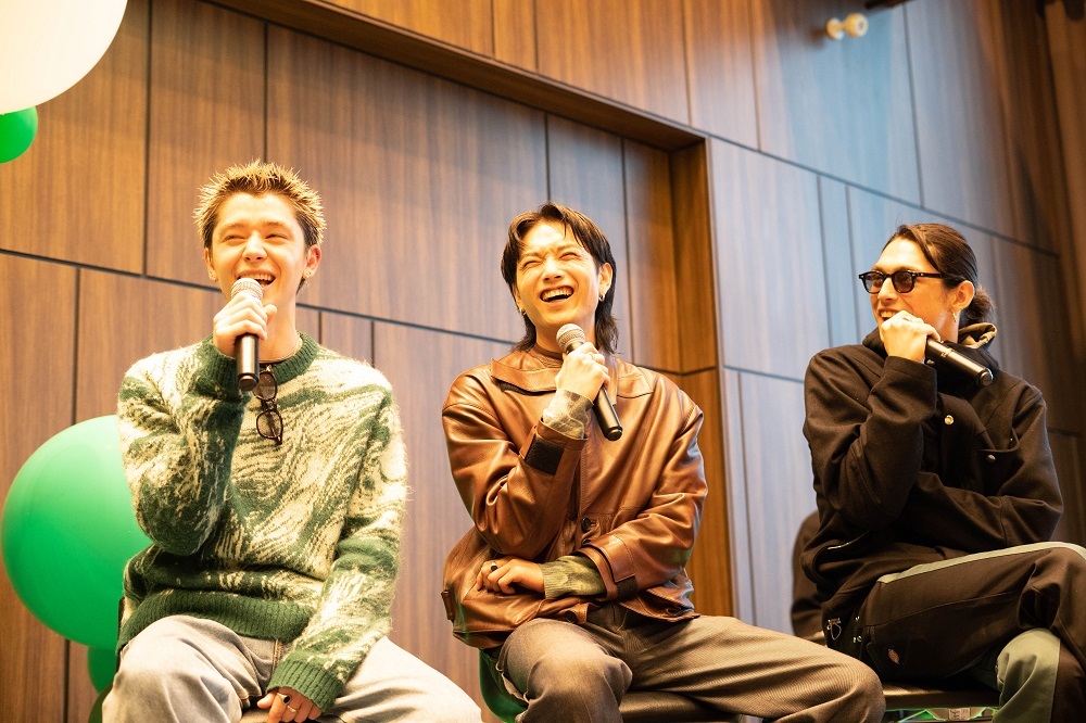 17時になり、まず初めに“ファッションと音楽のイイカンケイ”をテーマにしたトークセッションが行われた。MCは菅野結以。モデル、ラジオDJといった顔を持ち、自身のブランド・Crayme,も運営する、まさに今回のテーマを体現する人物だ。トークゲストにはスタイリストのRIKU OSHIMAと、モーガン蔵人、ローズ、深水光太によるOUR'sが登場。OSHIMAは二階堂ふみ、池田エライザ、仲野太賀、坂口健太郎といった俳優や、水曜日のカンパネラ、KID FRESINOらのスタイリングを手掛け、ファッションという視点からさまざまなカルチャーに触れてきた。OUR'sはファッションをメインテーマにしたYouTubeチャンネル「OUR's / 僕らのチャンネル」で注目を集めている新世代のアイコン。菅野とOSHIMA、OSHIMAとOUR'sは兼ねてから交流があったこともあり、序盤からテンポよく濃密なトークが始まる。