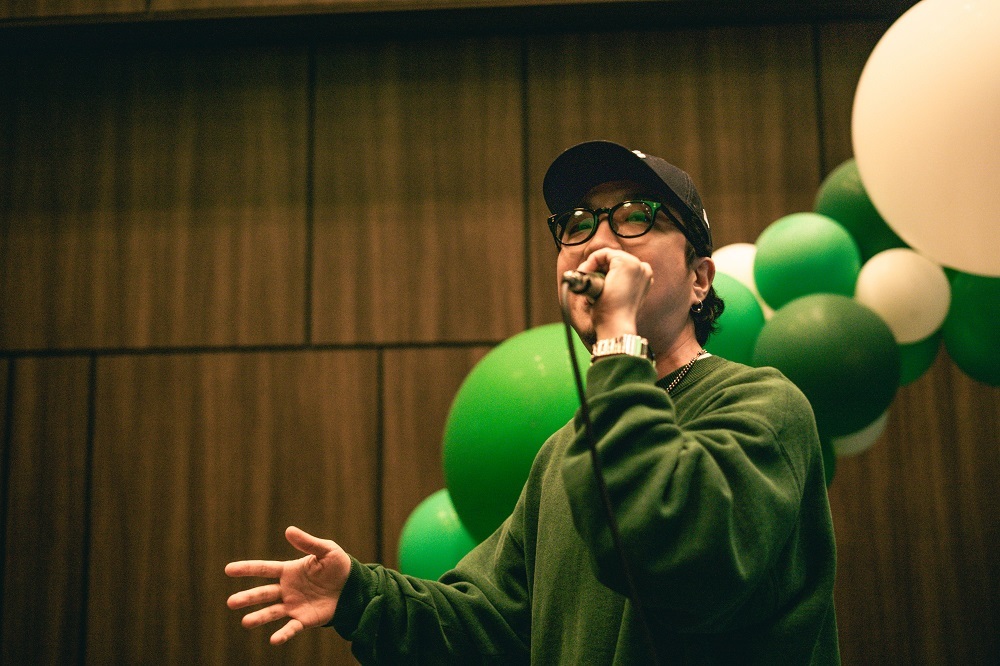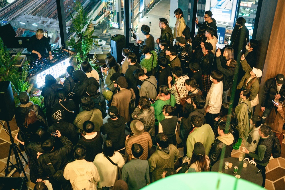 この日のテーマは“GOOD MUSIC × FASHION”。外はあいにくの雨にもかかわらず、開場の16時からテーマカラーのグリーンを身に付けた多くの人々が集まった。上階とは吹き抜けの構造になっている広々とした空間。ガラス張りの向こうには、渋谷のシンボル・スクランブル交差点を中心とした景色が広がるグッドなロケーション。フリーエントランスで、ドリンクの購入者には限定のオリジナルフィンガーフードが無料で提供され、来場者はそれぞれ談笑したり、撮影をしたり、思い思いに楽しみながら、この後の催し/アクトを待つ。