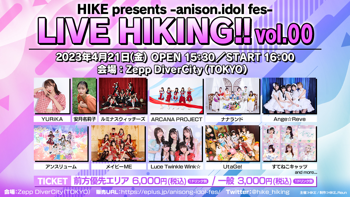 株式会社HIKEは、4月21日にZepp DiverCity Tokyoにて「-anison.idol fes-LIVE HIKING!! vol.00」を開催することを発表した。あわせて4月1日(土)10:00よりチケット販売を開始した。