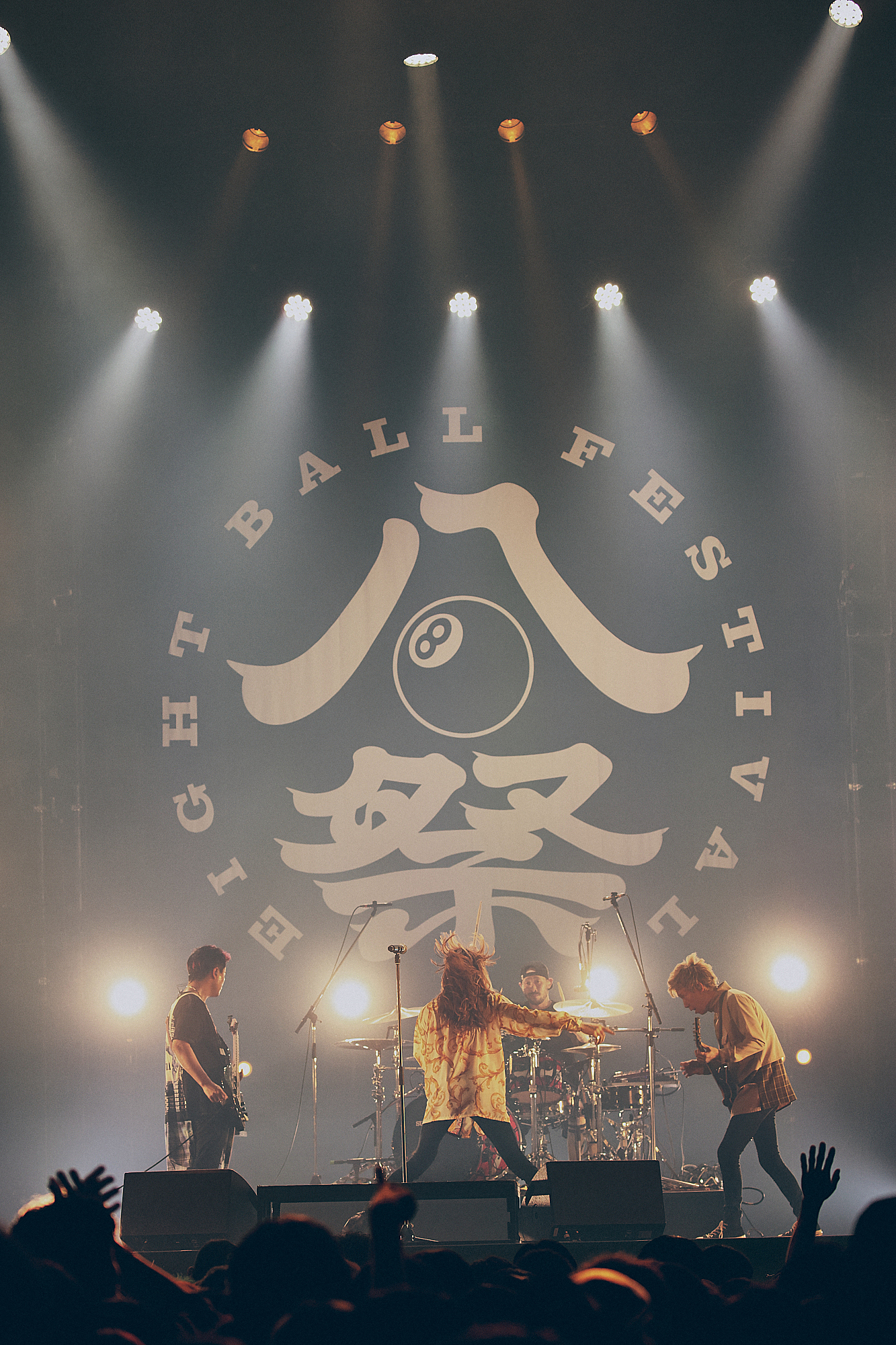 今やライブで多くを語らなくとも、それが音楽になっているSUPER BEAVERだったが、こうやって19年目のスタート地点に改めて思いを口にしたとき、このバンドは、この音楽は、人生を動かす原動力になると確信する。そんな渋谷の並々ならぬ気迫をもって「人として」を放つ愛にまみれながら、「まだまだやろうぜと、あなたに伝えるために俺たちはライブハウスからやってきました。すごく大きな会場なのは分かってる。でも、あなたとならライブハウスにできる気がする」とブチ上げたのは、「東京流星群」。何度SUPER BEAVERのライブを観ても、何度でも奮い立たされる。この曲が岡山の地に、『EIGHT BALL FESTIVAL』の出発点に鳴り響く意義は大きい。