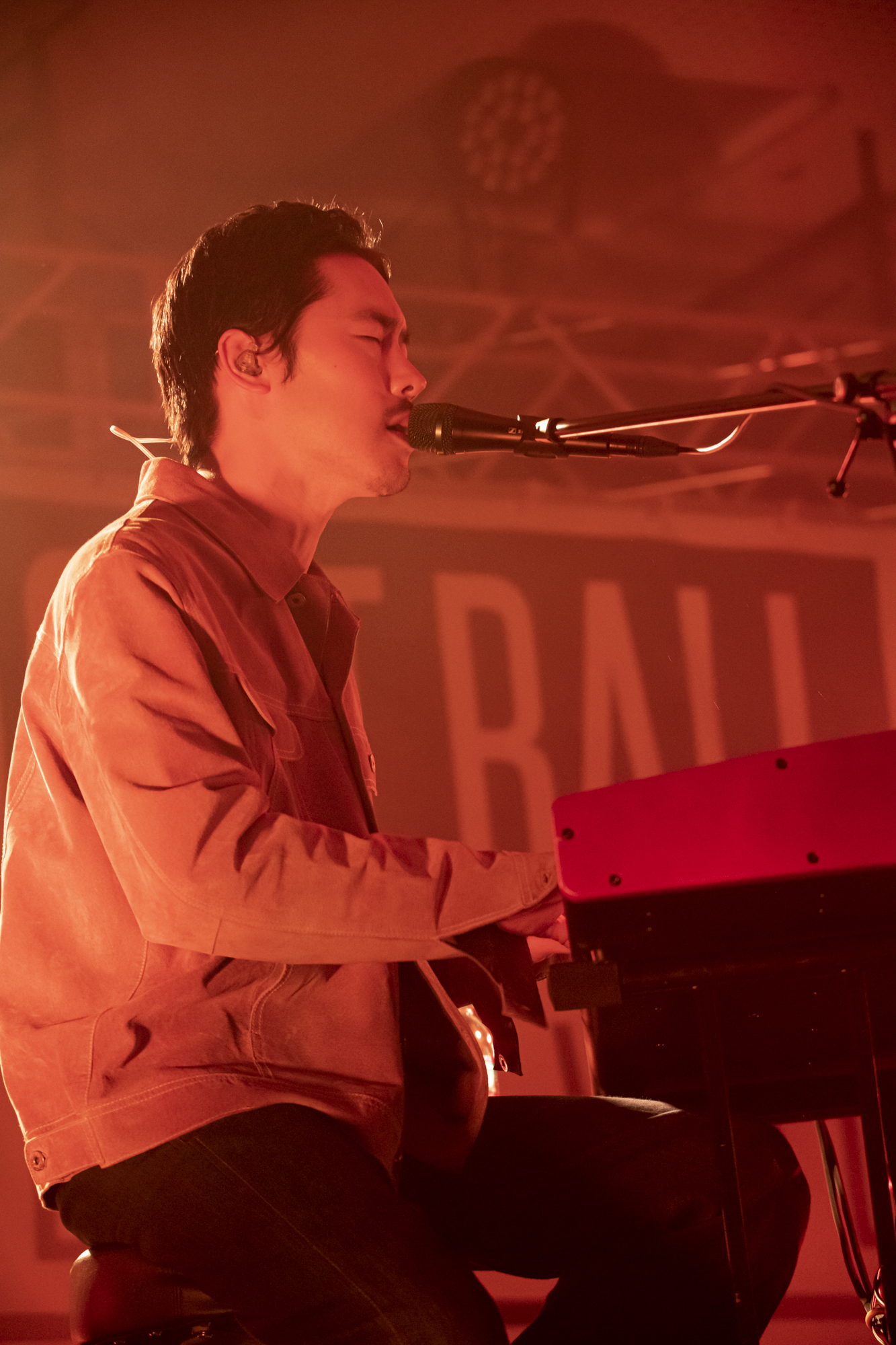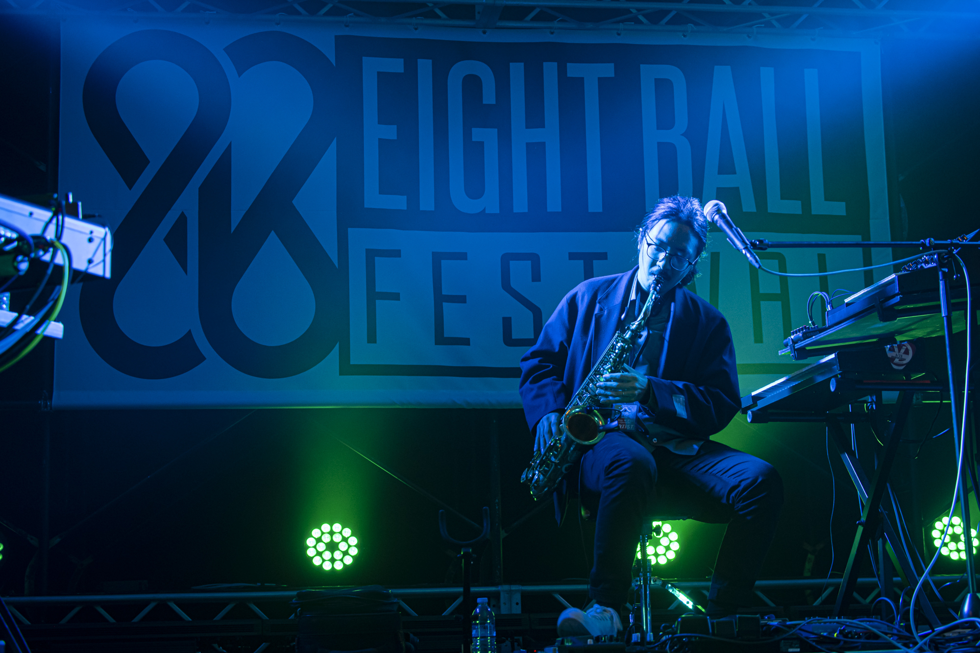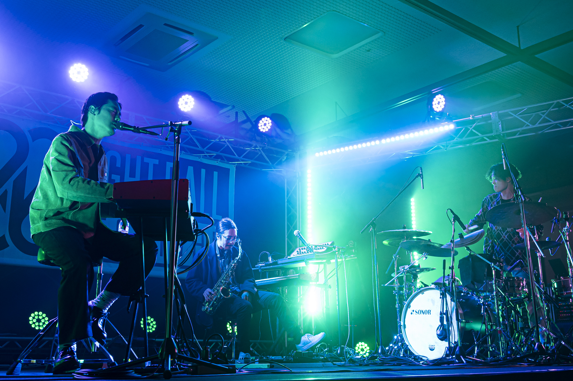 リハーサルから即興で「岡山に来れて嬉しい」と歌い、観客を楽しませていたのはTENDRE。今回は小西遼(Sax.Syn)と松浦大樹(Dr)の3人編成で出演となる。本編がスタートすると、「『エイトボールフェス』のチークタイム担当です、よろしくお願いいたします」と挨拶。この日のムードをガラッと変えるような、「Night & Day」で観客の心を瞬く間に惹きつける。続く「DRAMA」では、小西がシンセからサックスに持ち替えてプレイ。ジリジリと熱を帯びていくステージングに、観客も音に身を委ねて体を揺らす。