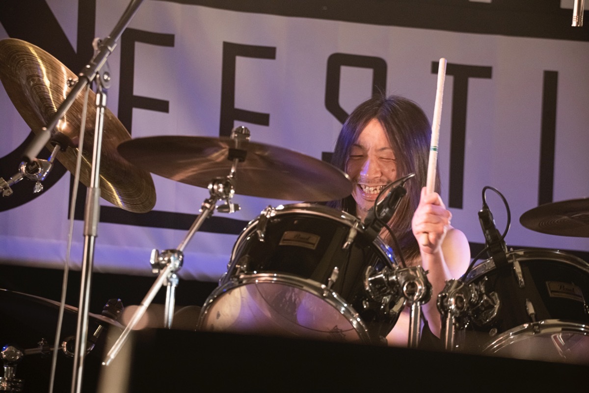 2日目のトップバッターは、地元岡山を拠点に活動するファスト、ハードコアバンドのIdolPunch。活動開始から30年、活動休止やメンバーの逝去などもあり、ライブの機会はそう多くはないが、今なお音楽ファンはもちろん、バンドシーンからも愛されているバンドだ。Racco(Vo)はバンドマンとして活動するだけでなく、ハンバーガー店「RACCOS BURGER」のオーナーとしての顔も持ち併せている。地元の若いロックファンや、フェス好きの人ならこの店を通じ、バンドの存在を知った人も少なくはないだろう。