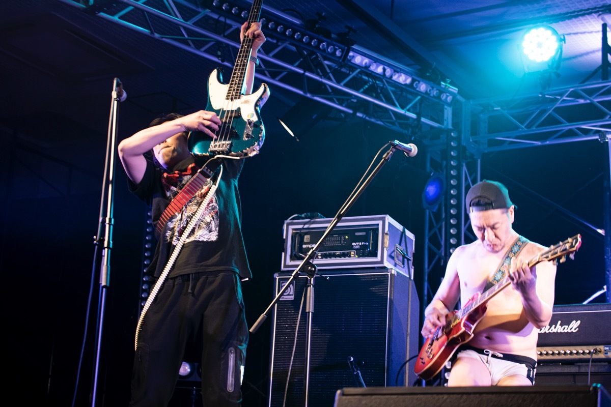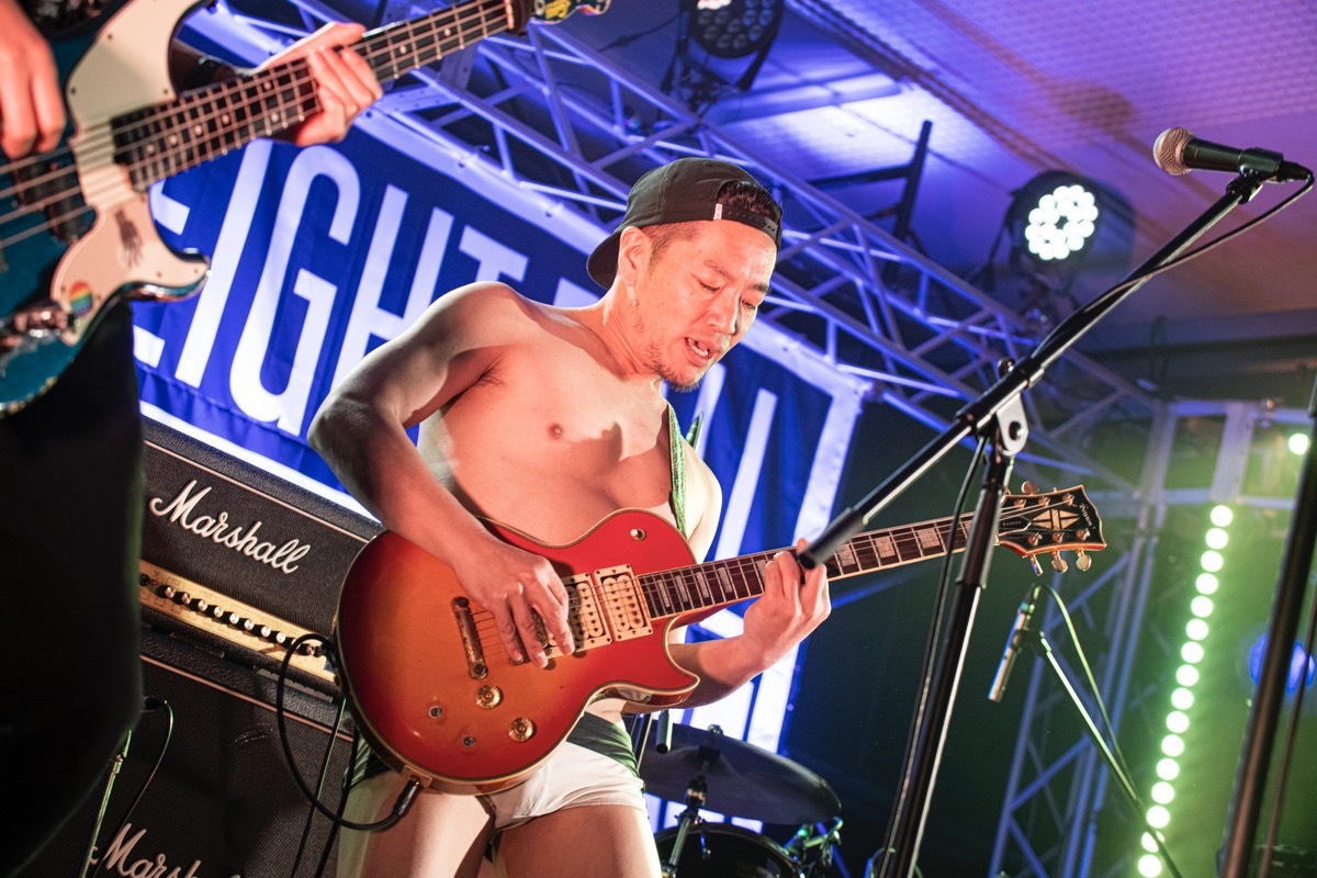 ようやくメンバーがステージインするが、Racco以外メンバーはみなパンツ一丁! フロアからは驚く人の声も聞こえたけれど、彼らのライブは気づけばほぼ全員が裸になっているので、パンツを履いているだけでもまだマシで……。この日のサポートベース、岡峰光舟は服着用だったことに違和感を覚えるという、なんだかよくわからない事態になってしまい、ライブが始まる前から楽しくって仕方がない。