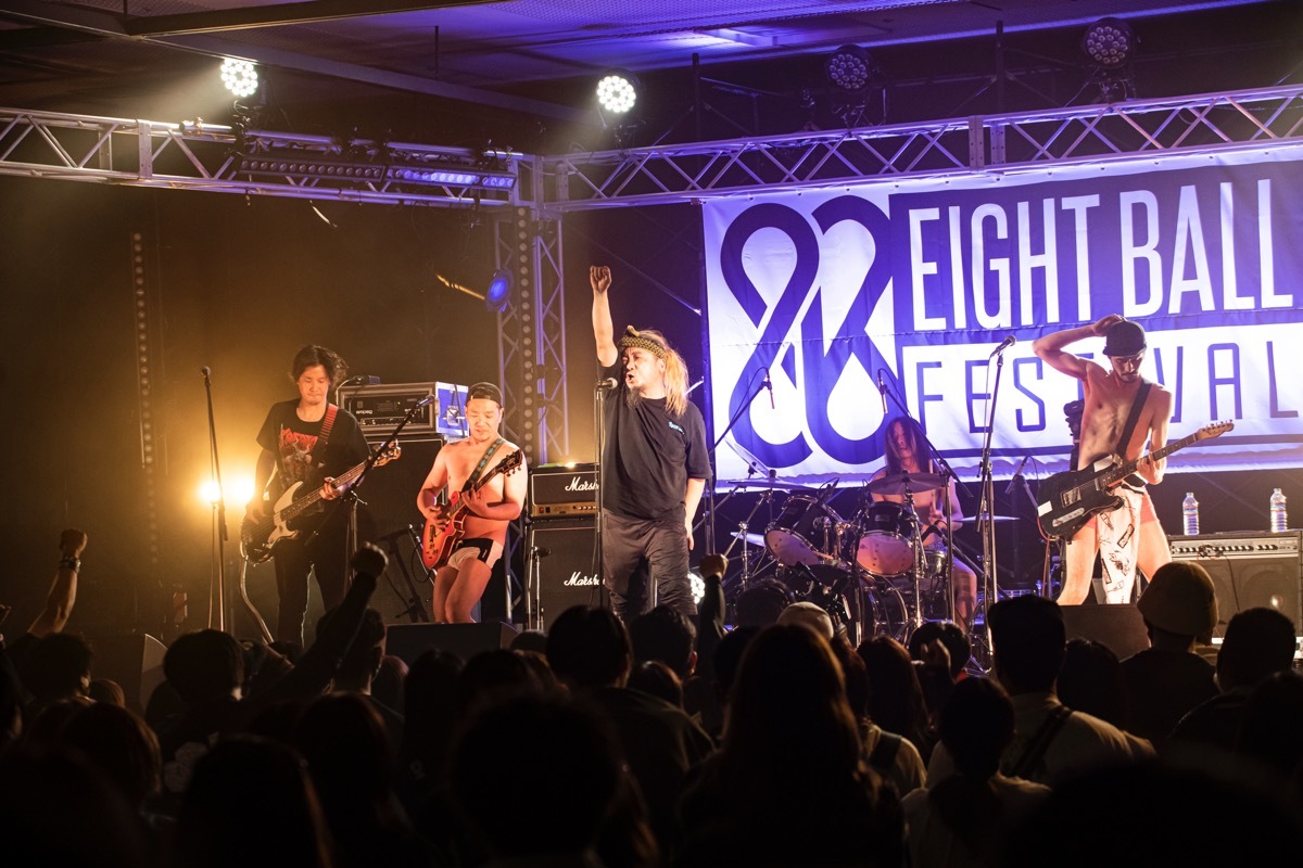 地元の雄として、トップバッターを勢いよく駆け抜けた彼ら。この日のステージ時間は20分と短いものの、そこに詰め込んだ曲数はなんと8曲! しかも、ファスト・ハードコアバンドらしく、大幅に繰り上げてステージは終了。これでもかと勢いを加速させ、『EIGHT BALL FESTIVAL 2023』2日目の幕を豪快に開いてくれた。