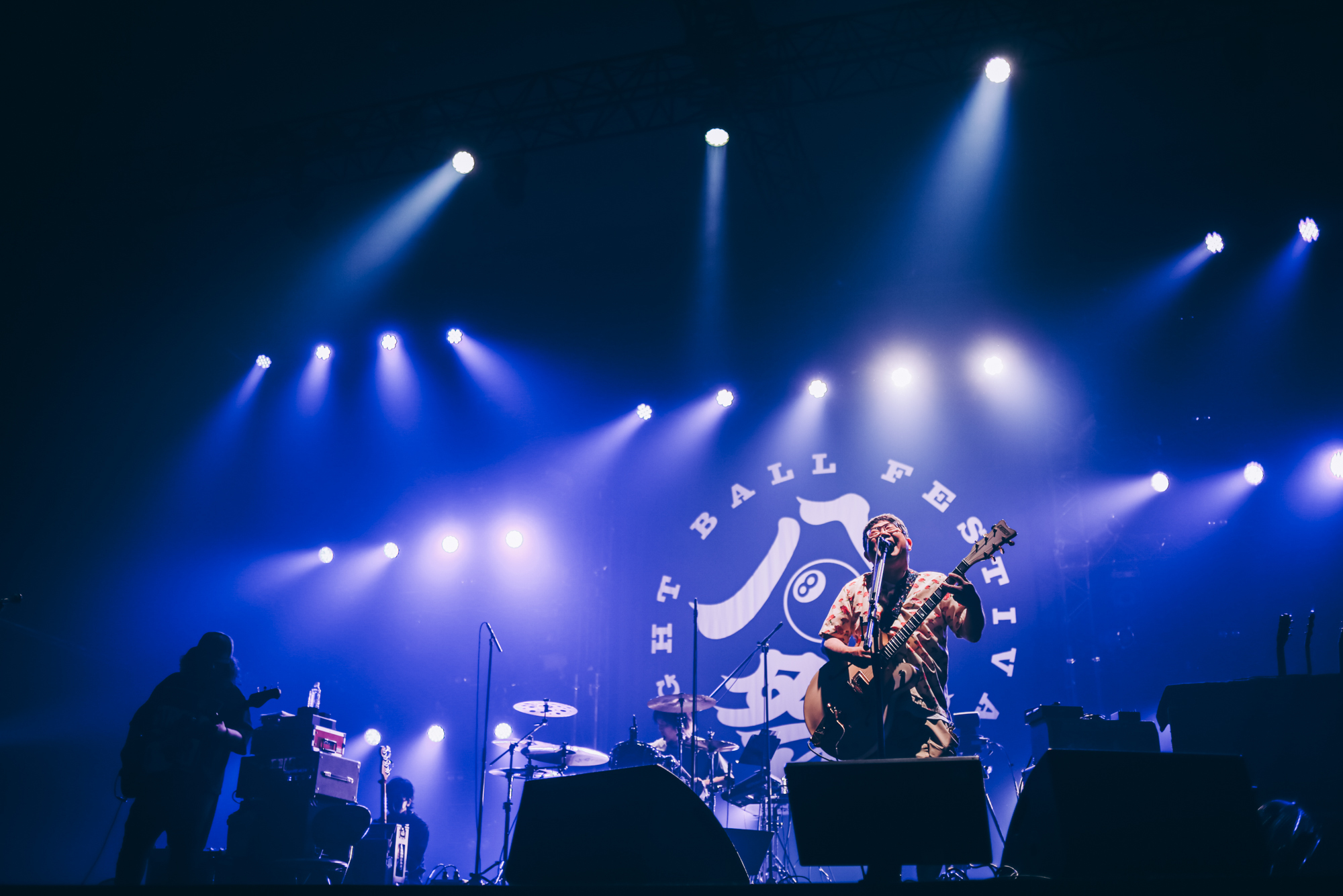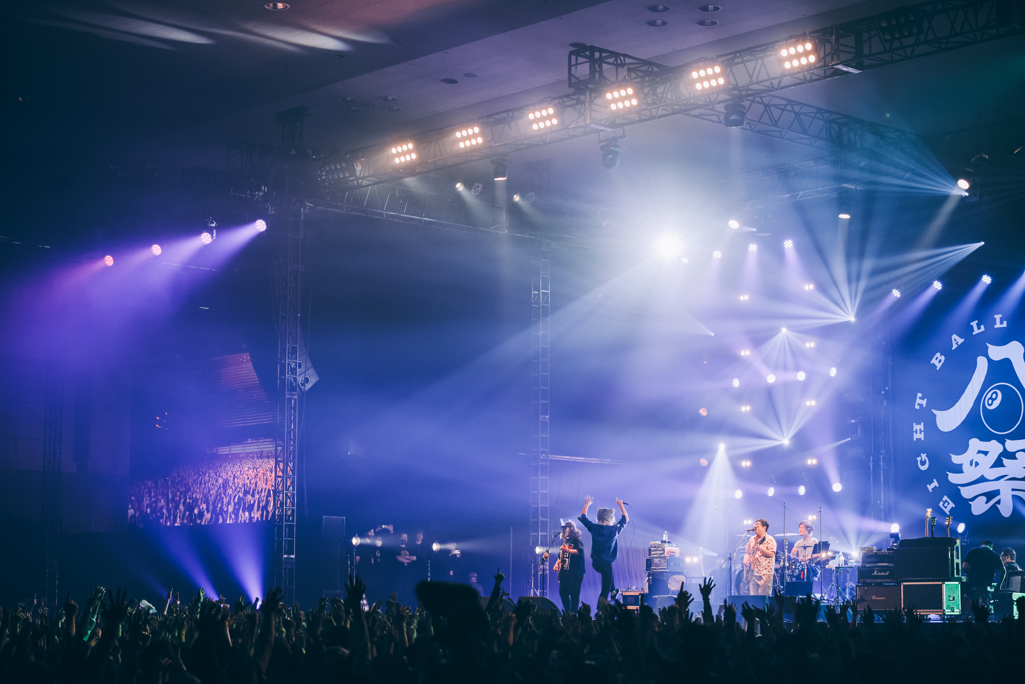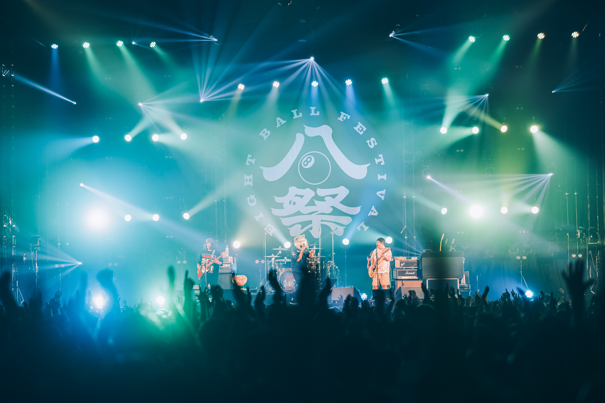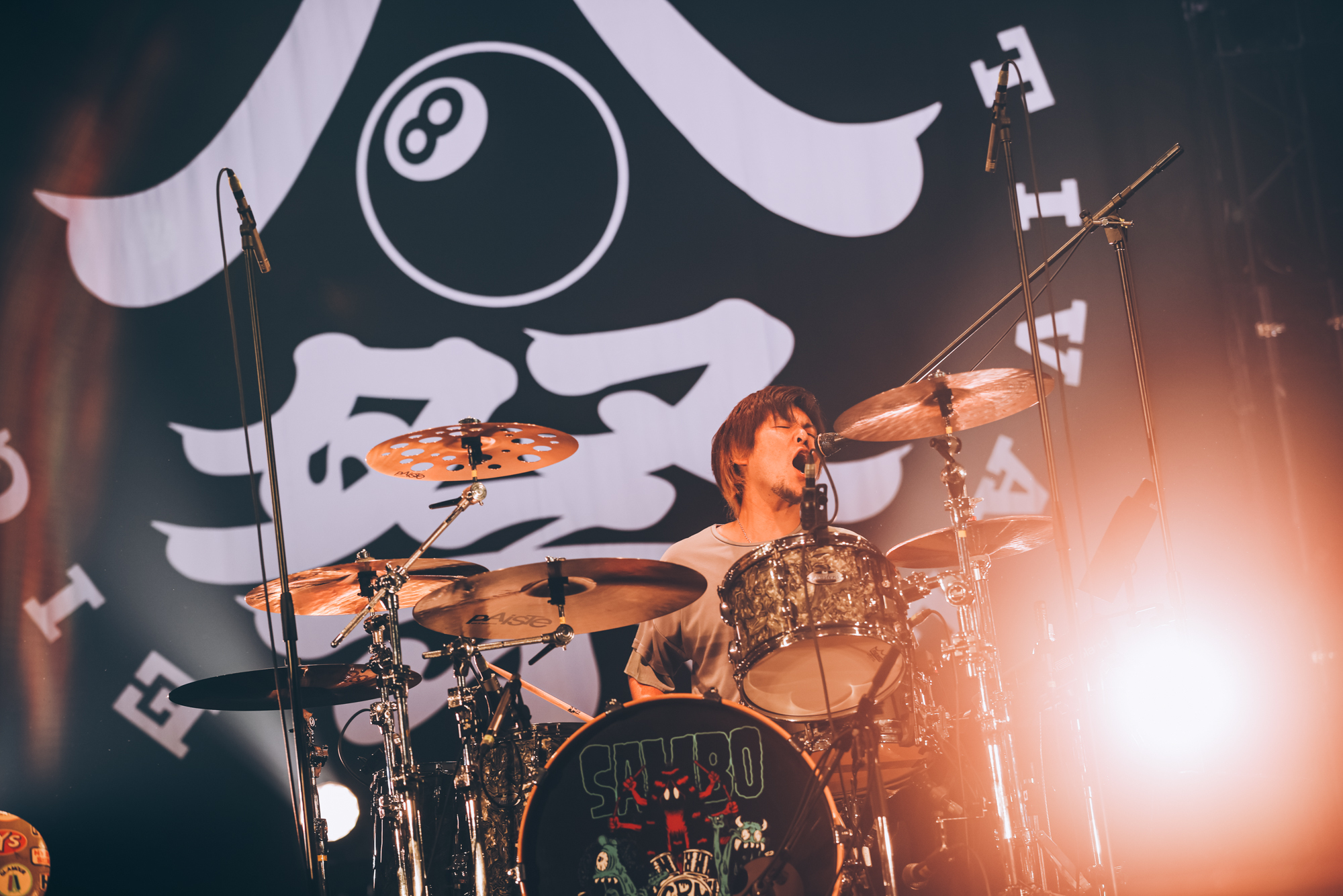 何度も何度も諦めず、心をすくい上げるそんな言葉に添えた「ラブソング」に、胸を揺さぶられないわけがないだろう。ここで、「やるんだよ。できるんだ。ロックンロールはできるんだ。俺たちに証明させろ!」と叫ぶと、何とMAN WITH A MISSIONのTokyo Tanaka(Vo)がステージへ! サンボ×マンウィズによる「できっこないを やらなくちゃ」が、『EIGHT BALL FESTIVAL』の歴史にいきなり名シーンを刻み付ける。「おめぇのことを探し出しに、おめぇの居場所を作りに来たんだ。悲しいことがあっても、またこうやってみんなで笑える呪いを掛けに来たんだよ!」と最後に捧げた「花束」まで、不屈の精神でロックンロールを鳴らし続けたサンボマスターだった。