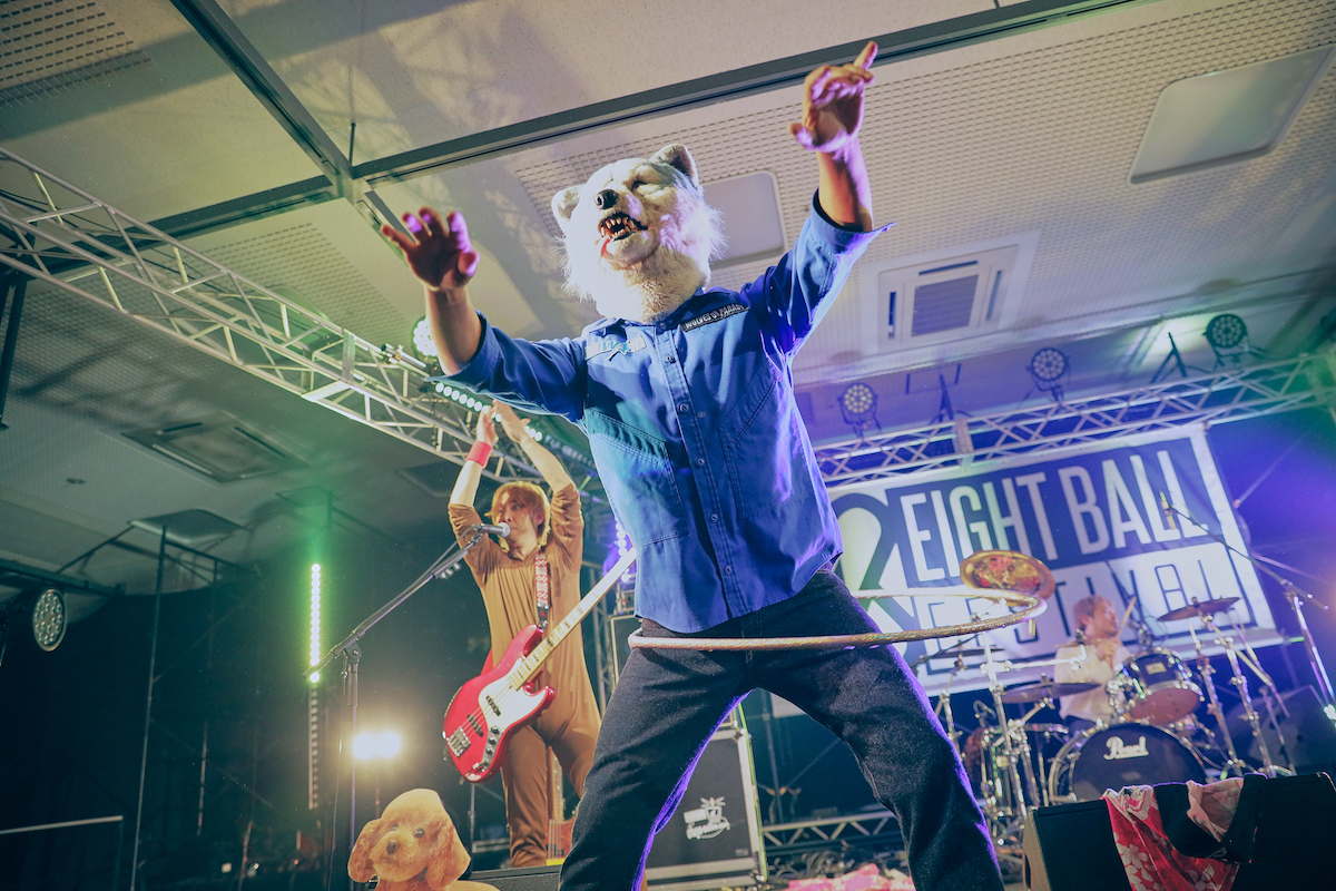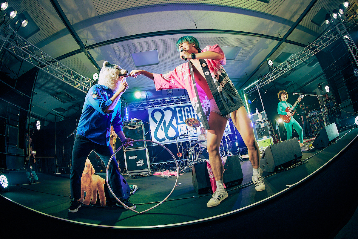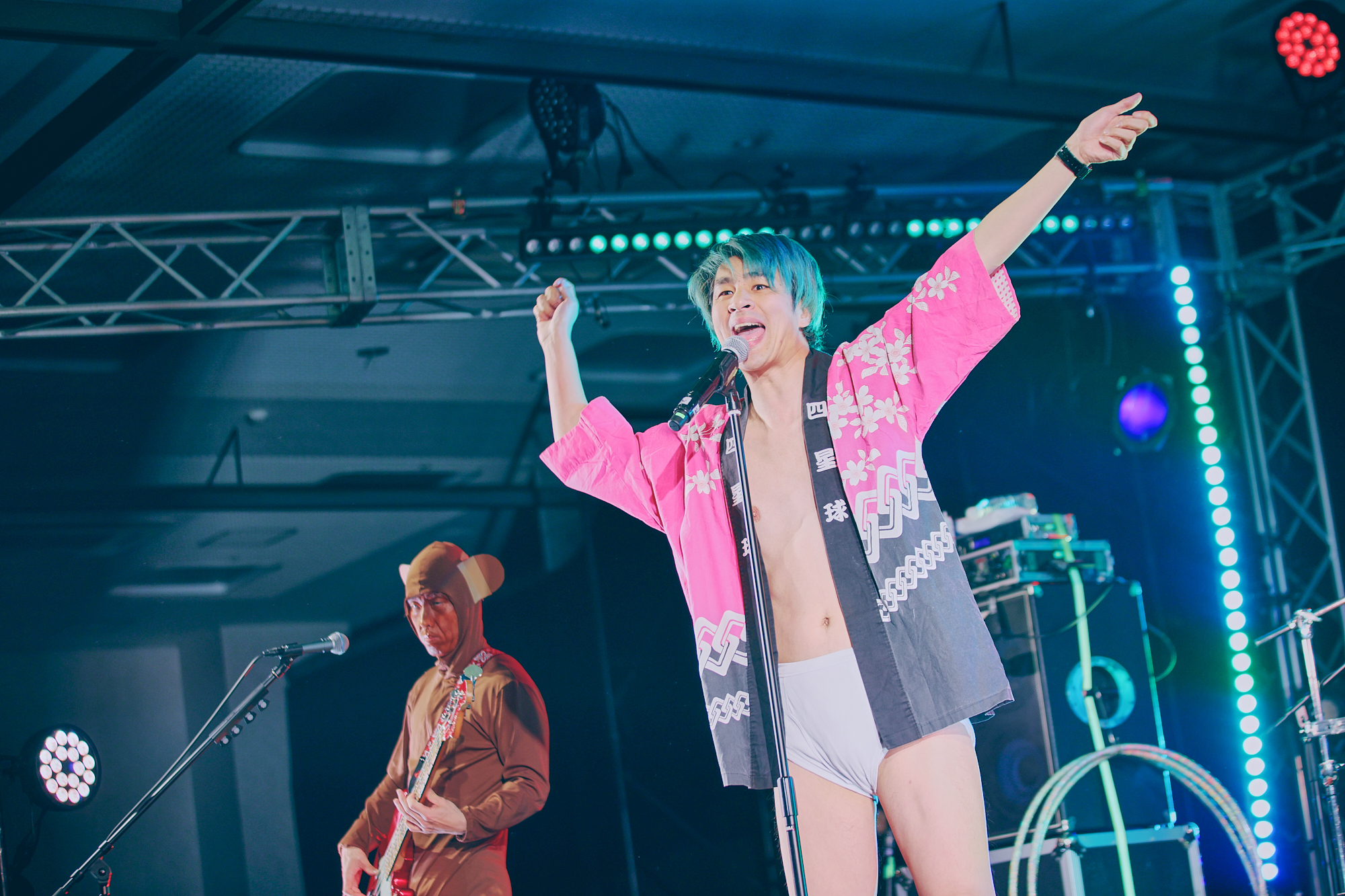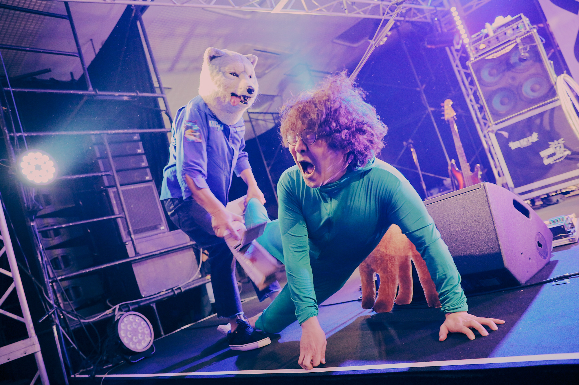 既にひととおり笑った後、タイムテーブルが定刻になりいつもの格好(?)でステージに登場したメンバーのBGMは「桃太郎」だった。そしてライブ楽曲演奏中、ステージにはまさかの狼乱入で、悲鳴に近いような声援もあがり、興奮に拍車がかかる。そして続いての曲は……「UMA WITH A MISSION」だったなんて。