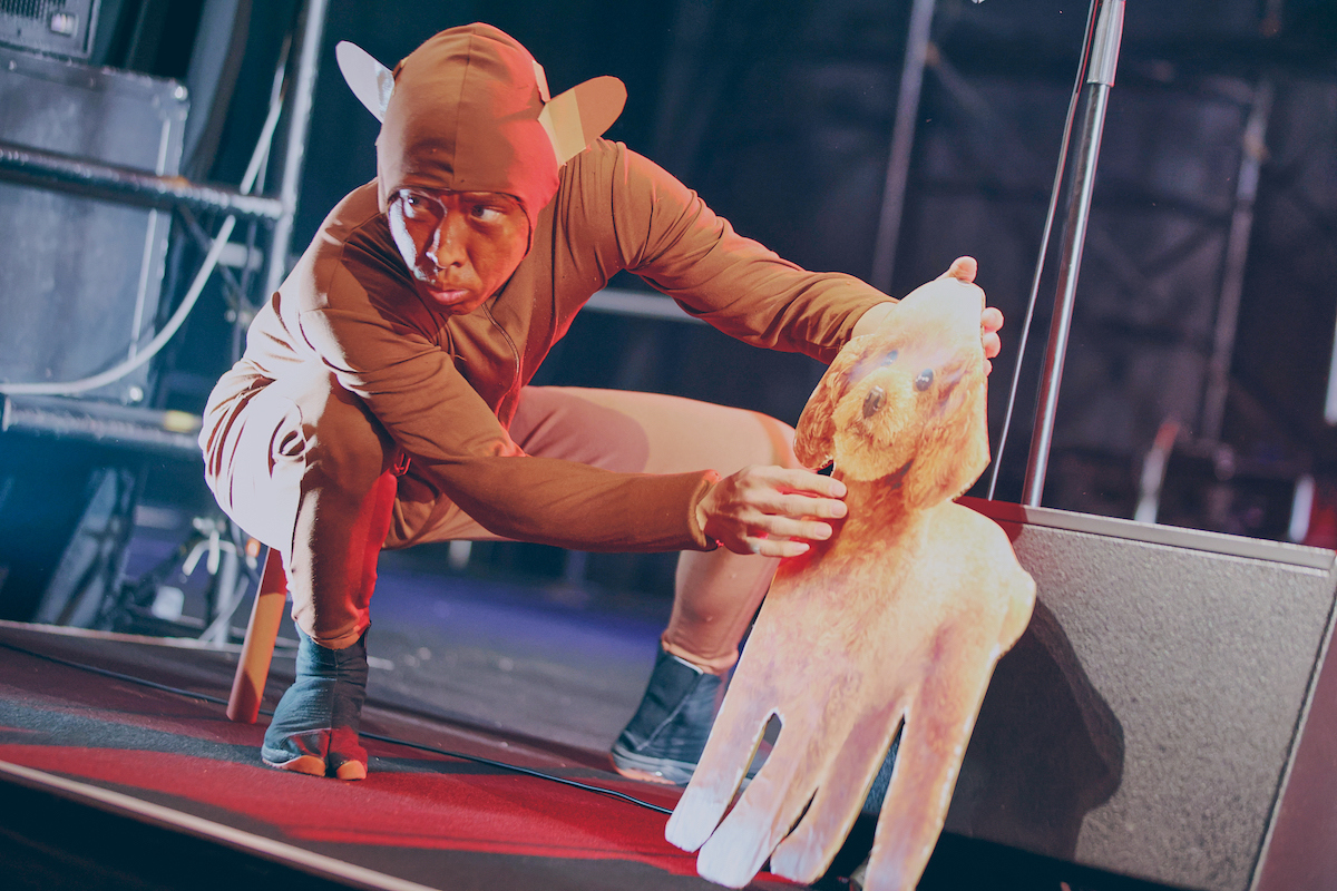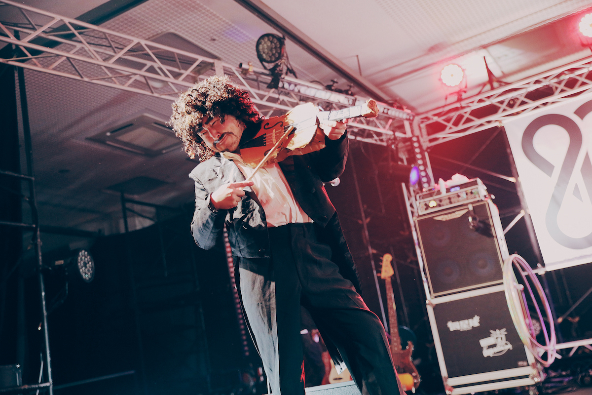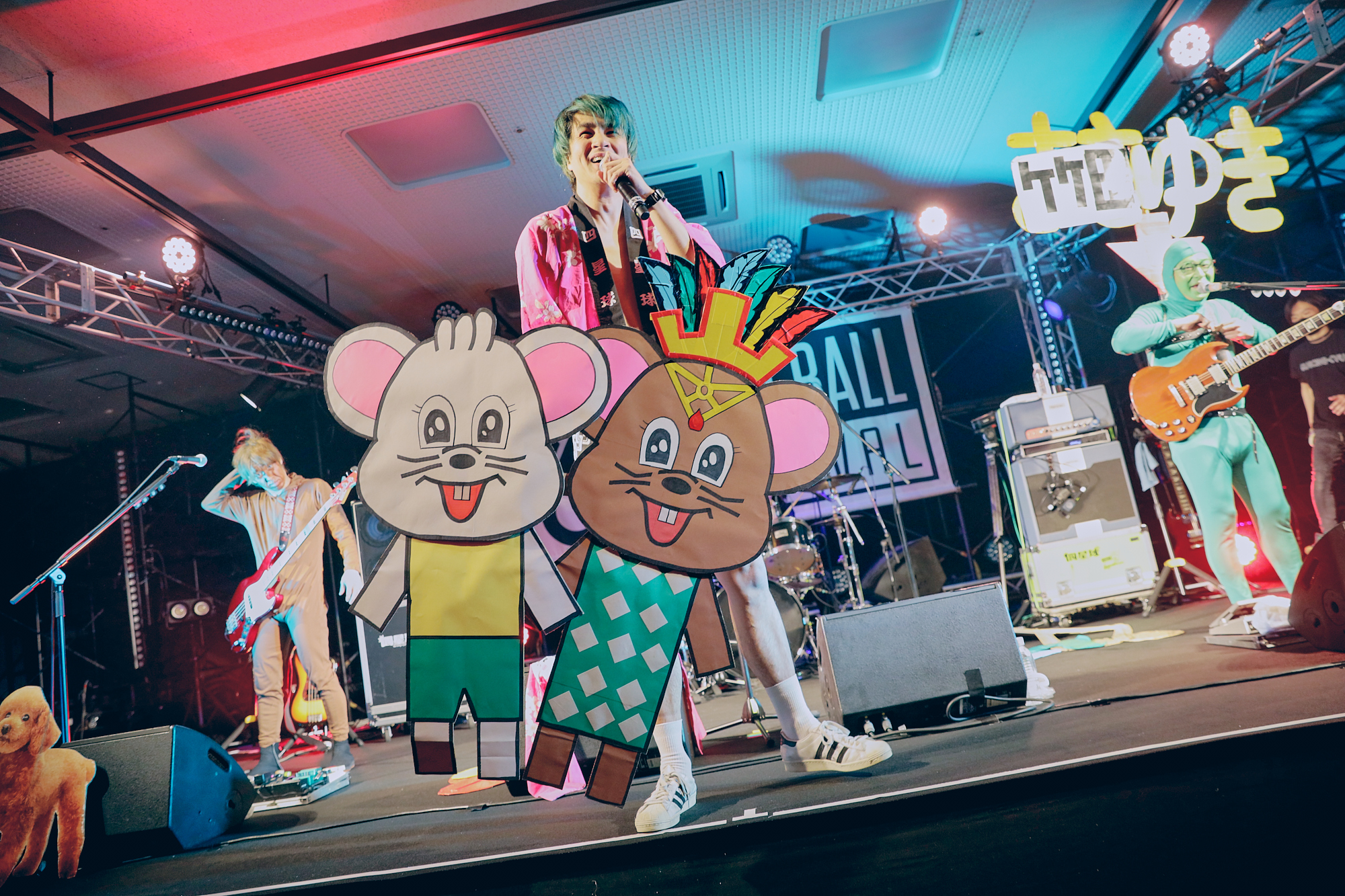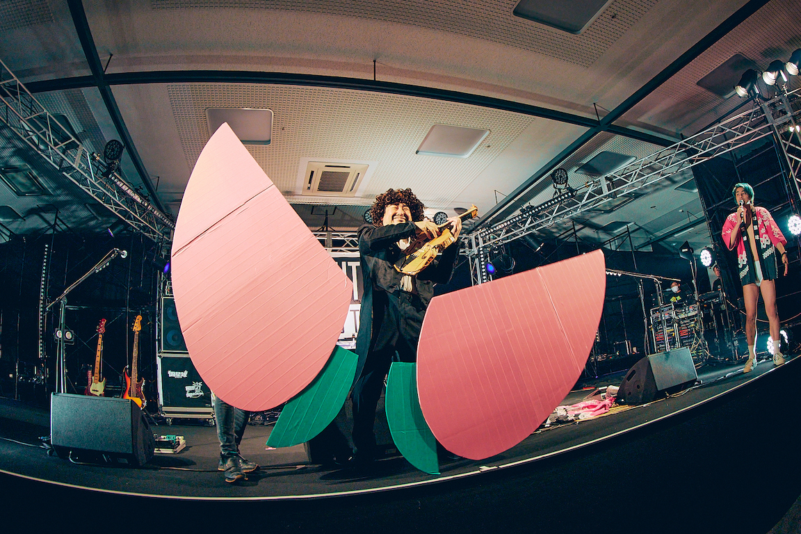 既にひととおり笑った後、タイムテーブルが定刻になりいつもの格好(?)でステージに登場したメンバーのBGMは「桃太郎」だった。そしてライブ楽曲演奏中、ステージにはまさかの狼乱入で、悲鳴に近いような声援もあがり、興奮に拍車がかかる。そして続いての曲は……「UMA WITH A MISSION」だったなんて。