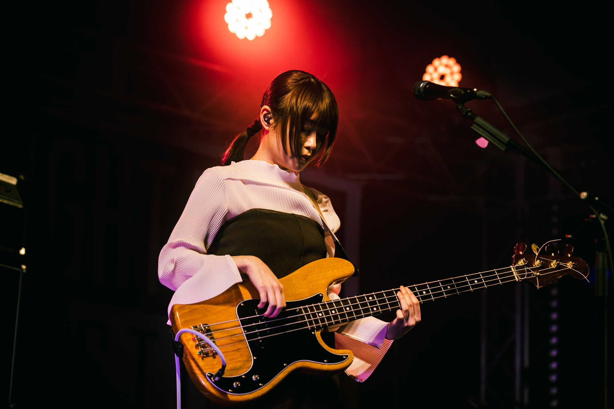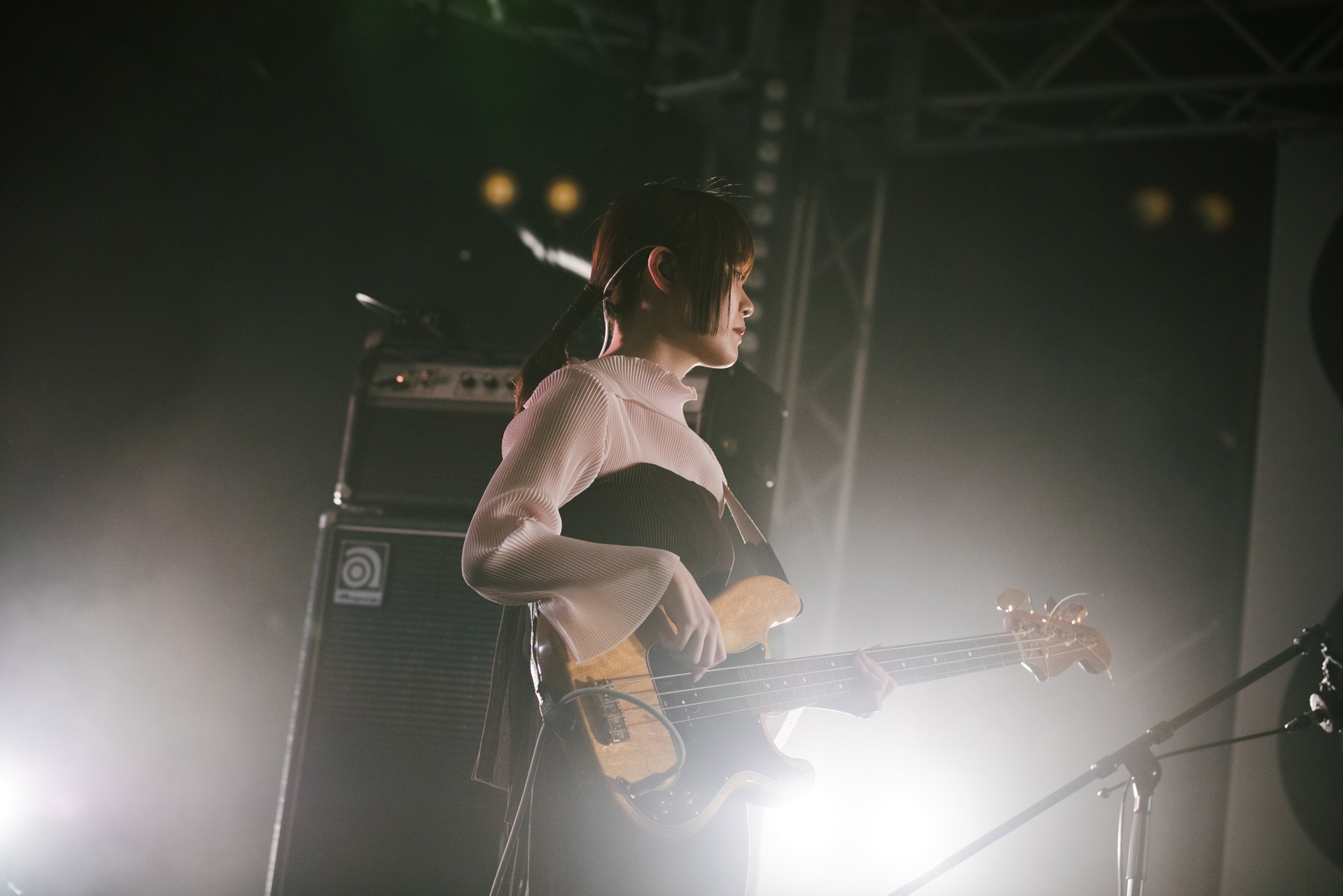 続けて、この3月にリリースされたばかりの新曲「永遠のブルー」を披露。春にぴったりの軽快なナンバーでクラップが巻き起こり、MCへ。「『エイトボールフェス』お誕生日おめでとうございます!」(塩塚、以下同)と祝福。さらに「ずっと言ってるんですけど、個人的に岡山がめっちゃ好きで……本当にいいところですよね。いつか移住するなら、岡山がいいな。あったかくて素敵な岡山に来れてうれしいです」と伝えられると、フロアは湧き立ち笑顔があふれる。なんともハッピーな空間に。