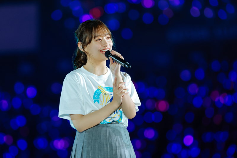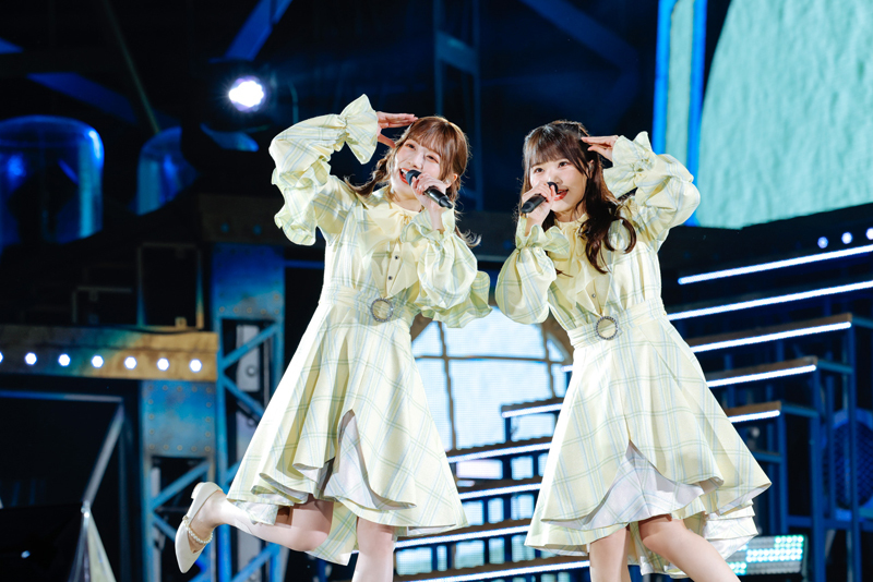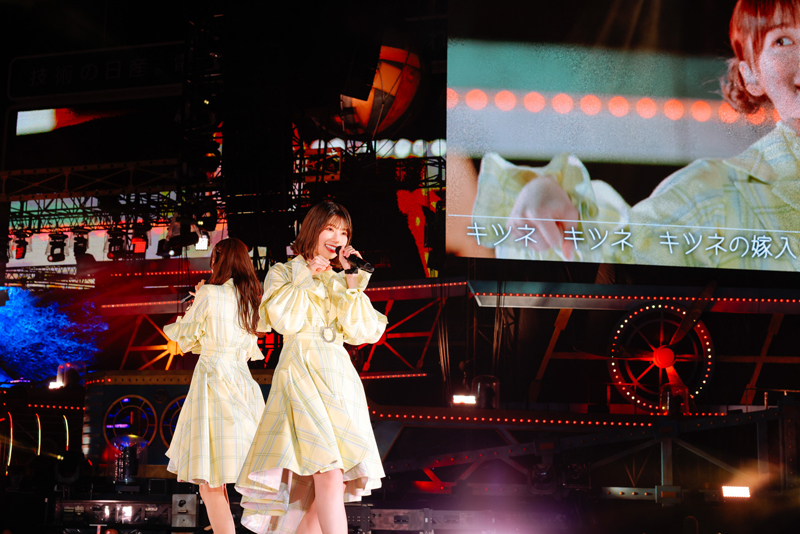ここで本日最初のMC。久美は「最初からすごい盛り上がりで。すごい! こうやって声出しのライブに来るの初めてっていう方もいらっしゃると思うんですけど、みなさんすごいですね。めちゃくちゃ声が出てます、お腹から」と、ファンの大歓声にしきりに感心していた。そして愛されキャラの河田陽菜が「月がキレイで、ライブ中も100回くらい見ちゃいました」と不安にさせる発言をすると、久美が「おひさまが光ってるから月も光ってるんだよね」と微妙に意味不明な回収をしてファンを笑わせるという一幕もあった。