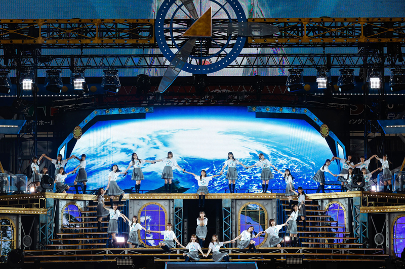 ここからは期別の曲を披露。最初に登場した四期生は、藤嶌果歩の「全力疾走でお届けします!」という宣言とともに「ブルーベリー&ラズベリー」をパフォーマンス。アリーナ中央のステージから放射状に伸びた花道を元気に駆け、ファンの目の前で踊った。間奏では、センターを務める清水理央が音頭を取り、37,000人のファンが巨大なウェーブを作った。