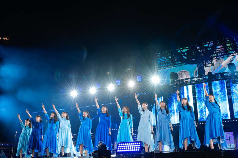 今回のライブは、屋外というシチュエーションを生かした〝空の旅〟がテーマ。野球のユニフォームを脱いでそら色のCA風のコスチュームになったメンバーたちは、「ドレミソラシド」を歌唱。間奏ではメインステージいっぱいにメンバーが広がり、シンクロダンスを披露した。一気に日が落ちたハマスタは、ファンの青いペンライトで埋め尽くされた。