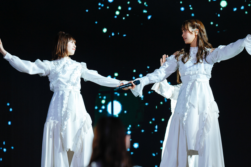 そして一期生、二期生も合流し、メンバー人気の高い楽曲「こんなに好きになっちゃっていいの?」へ。かつてライブで着用した真っ白なドレスに久々に袖を通し、切ない恋心を歌い上げた。