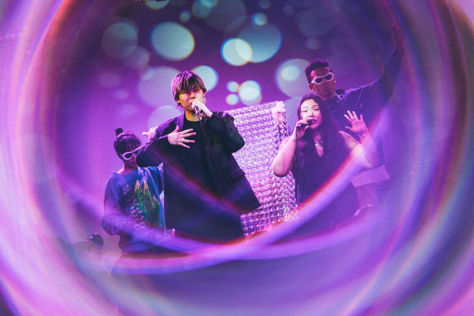 3番目に登場したのはウ山あまね。1曲目の『いたるところ』で幕を開けた。咀嚼音のような、何かを飲み込むような、そして水が滴り落ちたかのような、はたまた作業音のような、目まぐるしく変わる不思議なサウンドデザイン。その中で響いていく温もりあるウ山の歌声はとても魅力的であり、聞き手に寄り添うような落ち着いたトーンが静かに会場の空気を掌握していく。パーティ全体のバランサーのようにチルな空間を作り出し、どうやってそんな音作ってるんだろう、と思ってしまう遊び心満点でハイセンスなサウンドが一人一人の心をグッと掴んでいった。続く『デン』も混沌とした音の中で瑞々しい歌を乗せていて、ステージの中央でPCとスタンドマイクに向かうクールな佇まいと、先鋭的で攻撃的な音のバランスが光る。そして様々な音の中で〈君しかいないのに〉というフレーズをサンプリングして繰り返すと、そのまま『Hiuchiishi』へ。焦らしに焦らしてようやくウ山が歌った時には待ってましたとばかりに歓声が上がった。