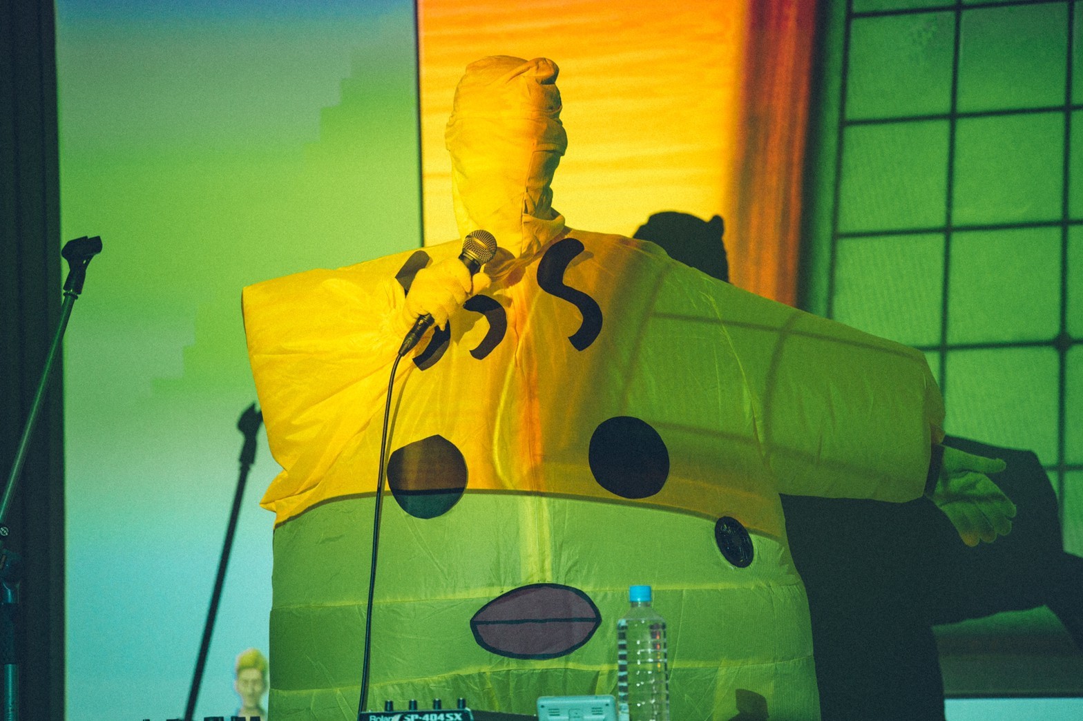 定刻17:00を回り、エキストラがライブの始まりを告げるベルをチリン、と鳴らすとカルロスまーちゃんが登場。ピンク色のメルヘンチックな大きい帽子が彼女の表情を隠し、謎に包まれたような空気感で歌う1曲目の『サケバラ』はとても美しかった。曲を終えて「よろしくお願いします、カルロスまーちゃんです」と一言挨拶をすると、『すだれさんビート』を披露。エキストラ2人が布を掲げてセルフ背景を作り、その前で歌うというなんともシュールな構成と、曲が終わるごとに使用した布を雑に投げる様子が面白くてクスッと笑ってしまった。しかもエキストラはサングラスで真顔。謎に満ちていて面白い。そして3曲目に披露されたのはzzzのディファレントカバー曲「Binbo」。MVに出てくるおしゃれな部屋に飾られている布がオレンジ色なのだが、それと同じようなオレンジ色のセルフ背景の前で歌った。照明も”セルフ・ラブ”という楽曲のテーマにぴったりな、温かみのあるキュートな色味で照らしていく。ステージ上の3人がゆらゆらと左右に揺れるのに合わせてフロアも気持ちよさそうに左右に揺れ、そこからキャッチーで音にも声にも優しさが帯びている『マイルドネス』、陶酔感のあるサウンドが心地よい『テレスコープ』を立て続けに歌うと、チルなサウンドがしっとりと会場を包む『ときまか』をセルフ背景の後ろにまわり、シルエットだけを見せて美しく届けた。
