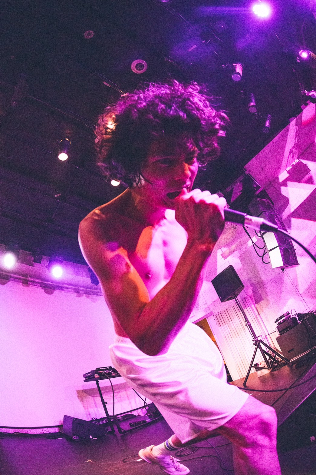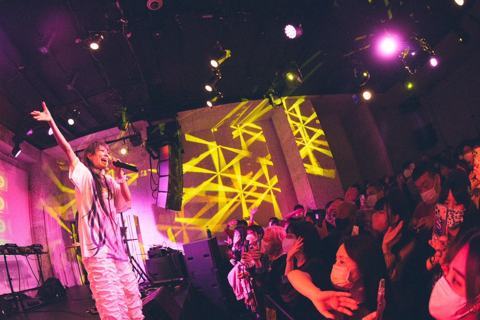 続いて二番目のhonninman。登場するや否や「矢沢永吉の真似がしたい。1曲目が始まる時に、ステージ袖ではなく楽屋にいて、自分の歌い始めに合わせて登場するっていうロックンロールを真似したい」という面白く危なっかしい試みからライブは始まった。「新生活を応援したいっていう気持ちがあるので、ステージに立つ人間が一番チャレンジングじゃなくてどうする」と笑いに包まれながらも大真面目に言い放ち、そうして真似した彼なりの矢沢永吉は、こだわったストロボ照明の中でスローモーションな動きで登場するという、結局honninmanらしすぎるカオスな形に。ただ、激しいストロボの照明がバン!と止まったタイミングで言い放った「honninman、本人です」がすごくカッコよく決まり、フロアからは歓声があがった。1曲目は『ノンケミカルロマンス』。ステージ上で自由に暴れながら、ヘビーなサウンドの中で持ち前の高音を響かせて歌い叫んだ。トラックに気持ちよく次から次へと言葉が乗っていく『粗忽バサラ』では、瞬時に声色、トーンを変える怒涛の展開でフロアのボルテージをあげると、間髪入れずに『あの人は大丈夫神話解体』へ。そして驚きの歓声が上がったSMAPの『夜空ノムコウ』を深みのあるいい声でワンフレーズ歌い、MCを挟んだのち、色んなサウンドがおもちゃ箱のように詰め込まれている『億万BOTCH』、『タートル・トーク』と、休む暇もなく怒涛のライヴを展開していく。