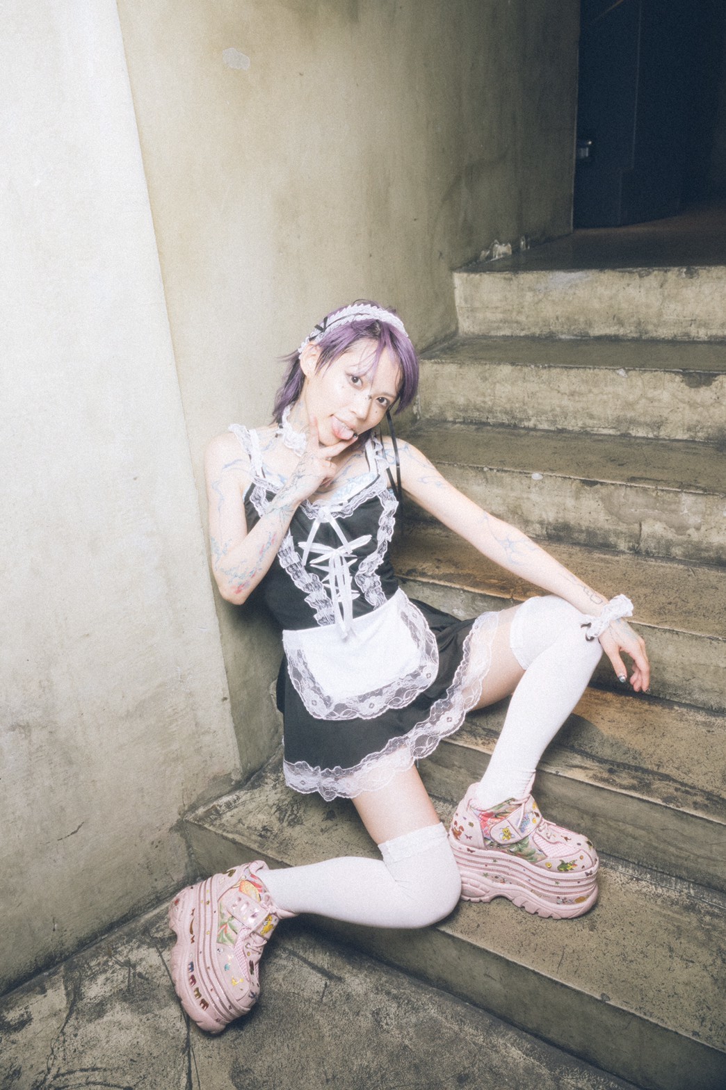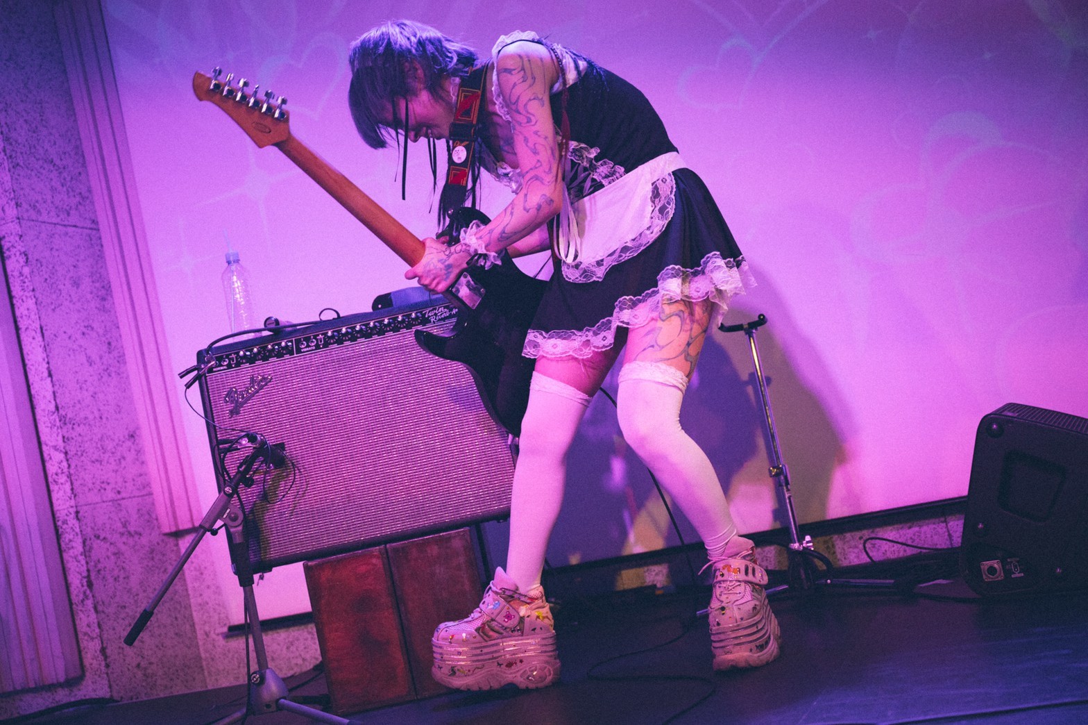 次に披露されたのは壮大な旋律が楽曲に広がりをもたらせるナンバー『Make love…』。透明感のある歌声とたまにキュッと可愛さが入り混じる彼女特有の声に魅了される。楽曲後半でなめらかで且つ激しいダンスパートを披露し、続く『ダンスナンバー』では観客が揃って左右に手を振って一体感を高めていった。間奏で「楽しいー!」と何度も叫ぶ百花。見ているこちらにもビシバシと伝わってくる幸せオーラ。会場に充満する楽しいという感情。日頃の疲れや不満を全て取っ払ってくれるようなピースフルな空間だった。続く『犬&猫』では、今回初めてのウ山との2人体制ライブということもあり、ウ山あまねRemixを披露。HumungasによるVJの盛大な宇宙の映像がウ山のRemixと絶妙にマッチし、その間に百花はキュートなメイド服に変身。この日最初から最後まではっちゃけていたことを象徴するように腰に手を当てて、“もう無理”といったような素振りを見せると、フロアからは「頑張れー!」という声が飛び交った。しかし、いざ歌が始まると疲れたのが演技だったかのようなパワフルなステージを見せつける。流石のキャリアを感じるライブ力だ。そして3月6日にデジタルリリースした新曲『あんたのラブドール』を、可愛い声と力強い声を瞬時に切り替えながら全力パフォーマンスをし、〈私はあんたのラブドールじゃない〉と叫びきると、「次で最後の曲です!」と『お前だけはガチで守る♡』へ。フロアからは息ぴったりのコールが飛び交い、久々に自由に声を出せるライブを全員が思い切り楽しんでいるようだった。盛りだくさんだった1日の最後の曲とは思えないくらい、百花もファンも全力で音楽を浴びていく。背景ビジョンにはなんと、百花、Humungas、ウ山あまねがプリクラを撮っている様子がキュートな映像に紛れ込みながら映し出され、はっちゃけている空気感をさらに磨き上げた。そして全身全霊のシャウトから、アウトロではノイジーなギタープレイを披露。可愛いらしい衣装とのギャップに彼女のバイタリティを改めて感じた。