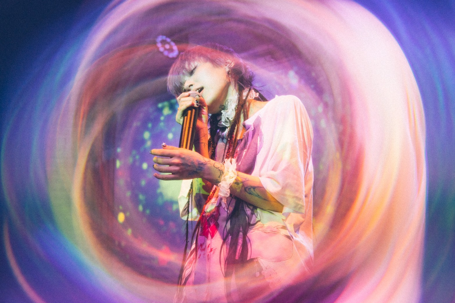 聞き手のツボを押さえたレイドバックするグルーヴが心地よく、そこから間髪入れずに、細やかに変化する音像のグラデーションが心地よい『来る蜂』へ。激しいストロボ照明の中で大きく声を張って盛り上がりを見せると、ギターを担いで熱狂的にパワフルなステージングを披露。どんどんライブのクライマックスに向けてエモーショナルになっていくパフォーマンスにフロアも歓声をあげたり、跳んだり、手を挙げたりと解放的になっていった。不規則で音数が少ないトラックに対してギターを歪ませ、力強く歌いきる。そしてMCでは、「調子いいね」という言葉を思わずフロアに投げかけた自分に対し、「うわ、なんか、俺調子いいとか初めて言った」と驚いていた。このパーティがいかにアツく最高なのかを感じる1シーンだ。その後、陶酔感のある『粉』を届けると、間髪入れずにそのまま『タペタ』へ。さまざまな音楽的要素で楽しませながら、耳馴染みの良い歌声を優しく音の上に置いていく。最後は壮大なサウンドの広がりを見せたのちに届けた『Ghostyard』。MCは少なく、とにかく1秒でも長く音を浴びてほしいと言わんばかりの充実感満点のライブだ。最後はロックにギターを弾き倒し、ラストに『siriasu』を披露した。フィナーレらしく、スケールの大きい曲を大胆に、そして大切に鳴らして幕を閉じた。