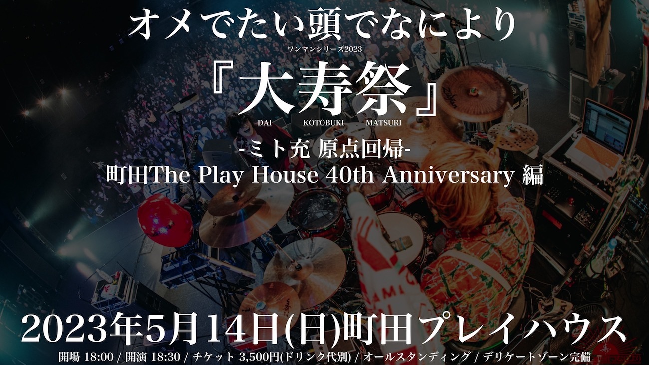 オメでたい頭でなによりが、ワンマンライブ『大寿祭 –ミト充 原点回帰–』(読み:だいことぶきまつり)を町田プレイハウスで開催することを発表した。