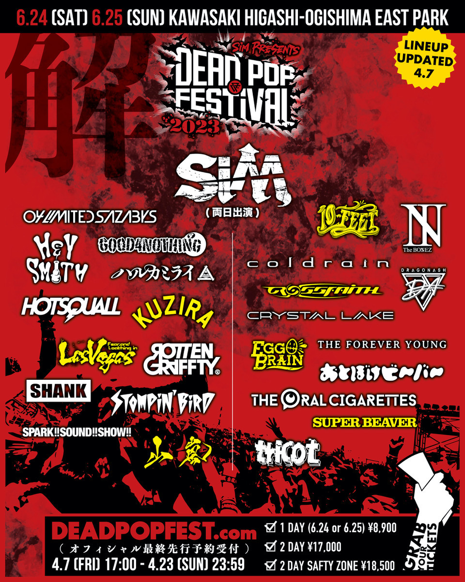 野外フェスとしては8年目、今年で13回目の開催となるSiM主催の野外フェス『DEAD POP FESTiVAL 2023 – 解 -』の全出演アーティストと日割りが発表された。