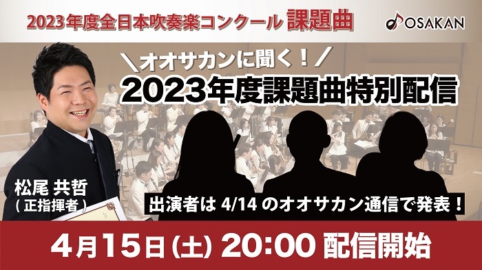 2023年4月15日(土)20時より、フィルハーモニック・ウインズ大阪の公式YouTubeチャンネルにて、全日本吹奏楽コンクールの課題曲に関する配信イベント『オオサカンに聞く!2023年度課題曲特別配信』が開催される。本イベントは、全日本吹奏楽コンクール課題曲にまつわる質問などに答えるライブ配信となる。