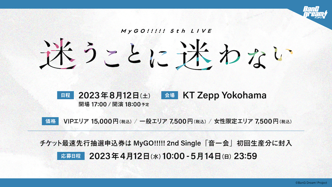 MyGO!!!!! 5th LIVE『迷うことに迷わない』はKT Zepp Yokohamaにて2023年8月12日(土)開催。チケットの最速先行抽選申込券は、4月12日(水)リリースのMyGO!!!!! 2nd Single「音一会」に封入されるとのことだ。