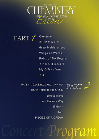 さらにインタビューの公開とあわせて、コンサートでの演奏プログラムも全曲発表された。インタビュー中のCHEMISTRYからも新たに追加される楽曲への期待が語られ、単なるアンコール公演に留まらないさらなる“挑戦”を想像させる内容となっている。
