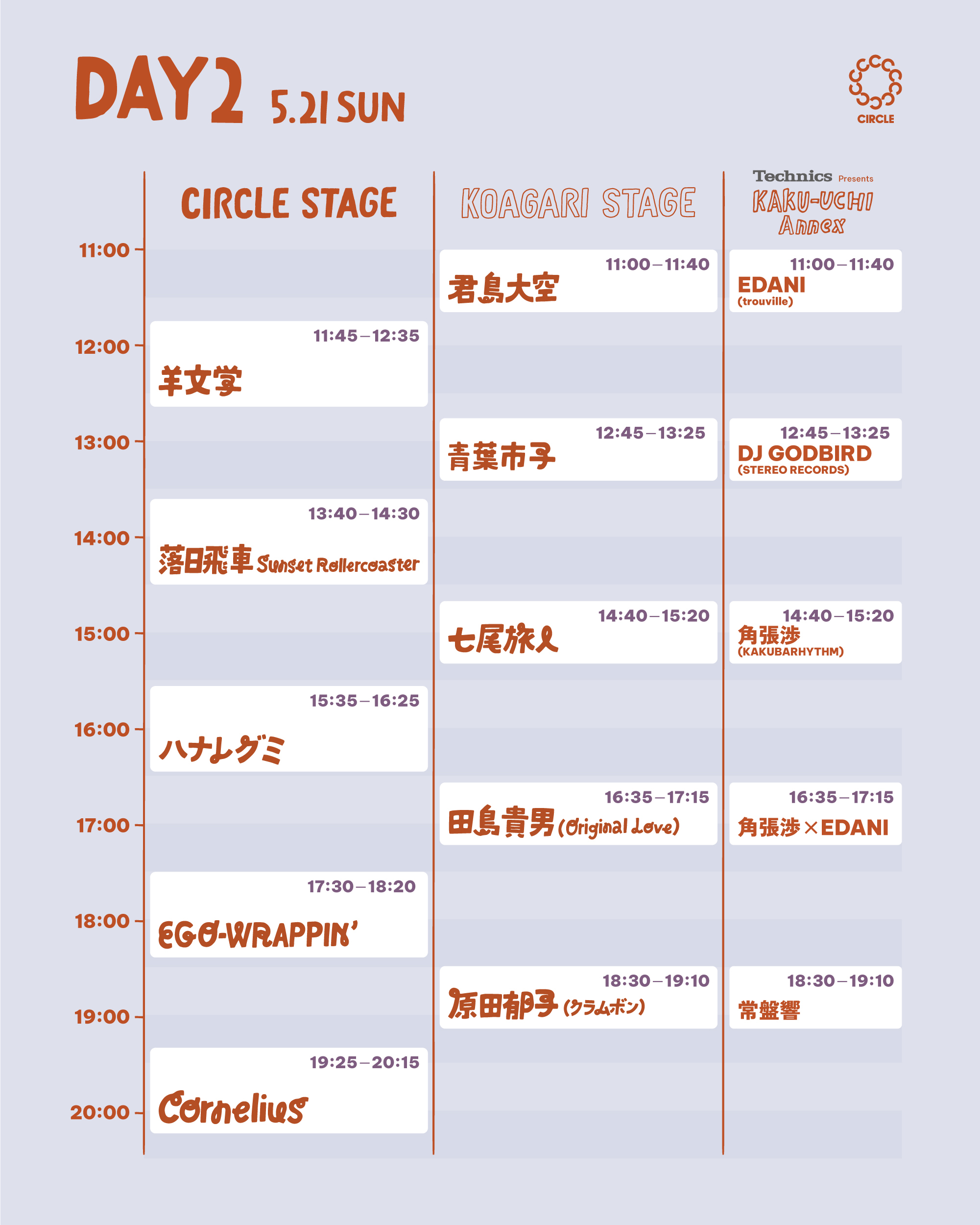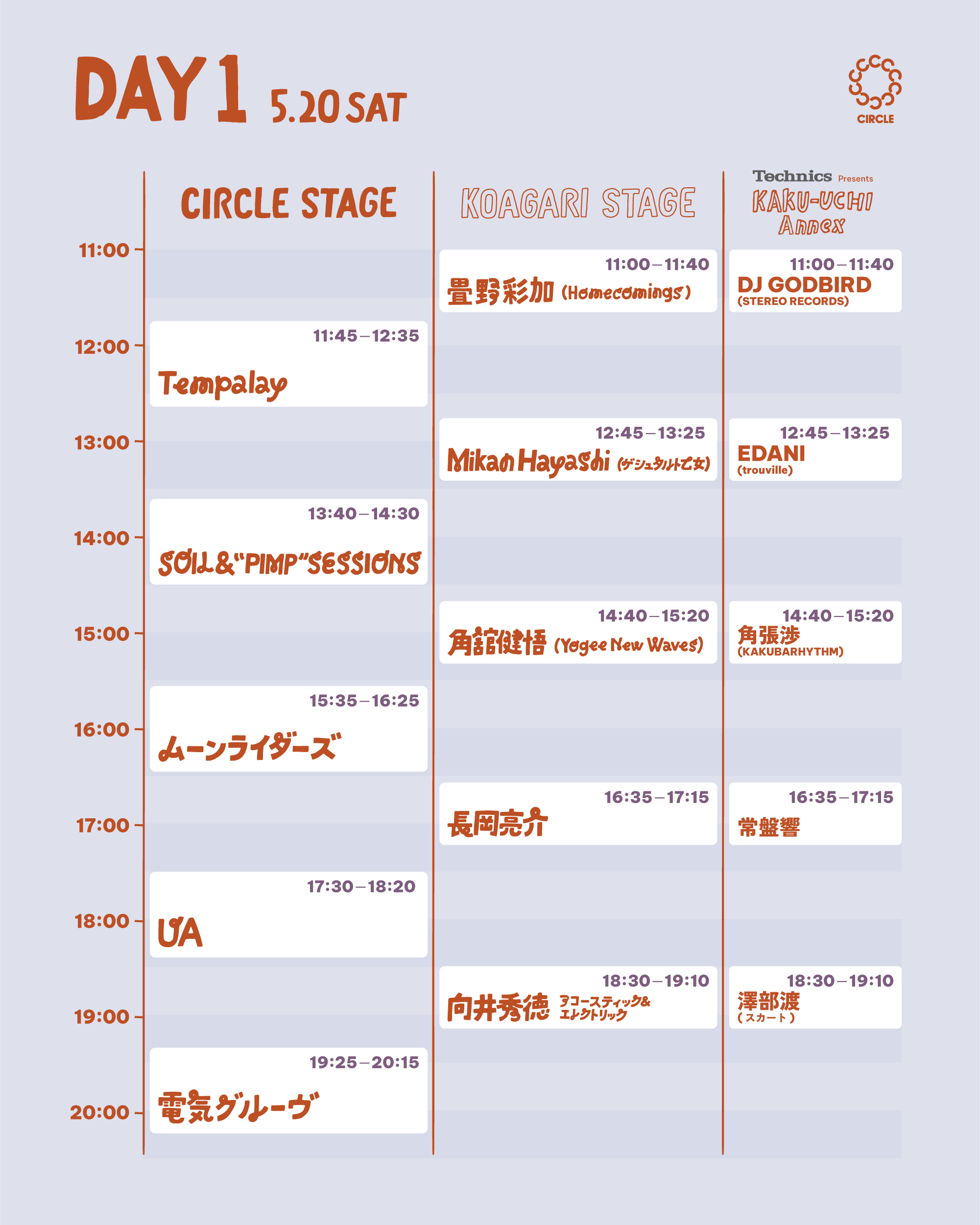 例年通り、ステージ構成はメイン・ステージの「CIRCLE STAGE」とセカンド・ステージの「KOAGARI STAGE」、そしてDJステージ「KAKU-UCHI Annex」の3ステージで開催となる。また今年の「KOAGARI STAGE」は各出演者による弾き語りで、地元・九州出身の向井秀徳、原田郁子がそれぞれトリを務める。DJステージには常連の常盤響、角張渉、EDANI、DJ GODBIRDの4名が出演、Day1には澤部渡(スカート)がDJとして特別出演する。
