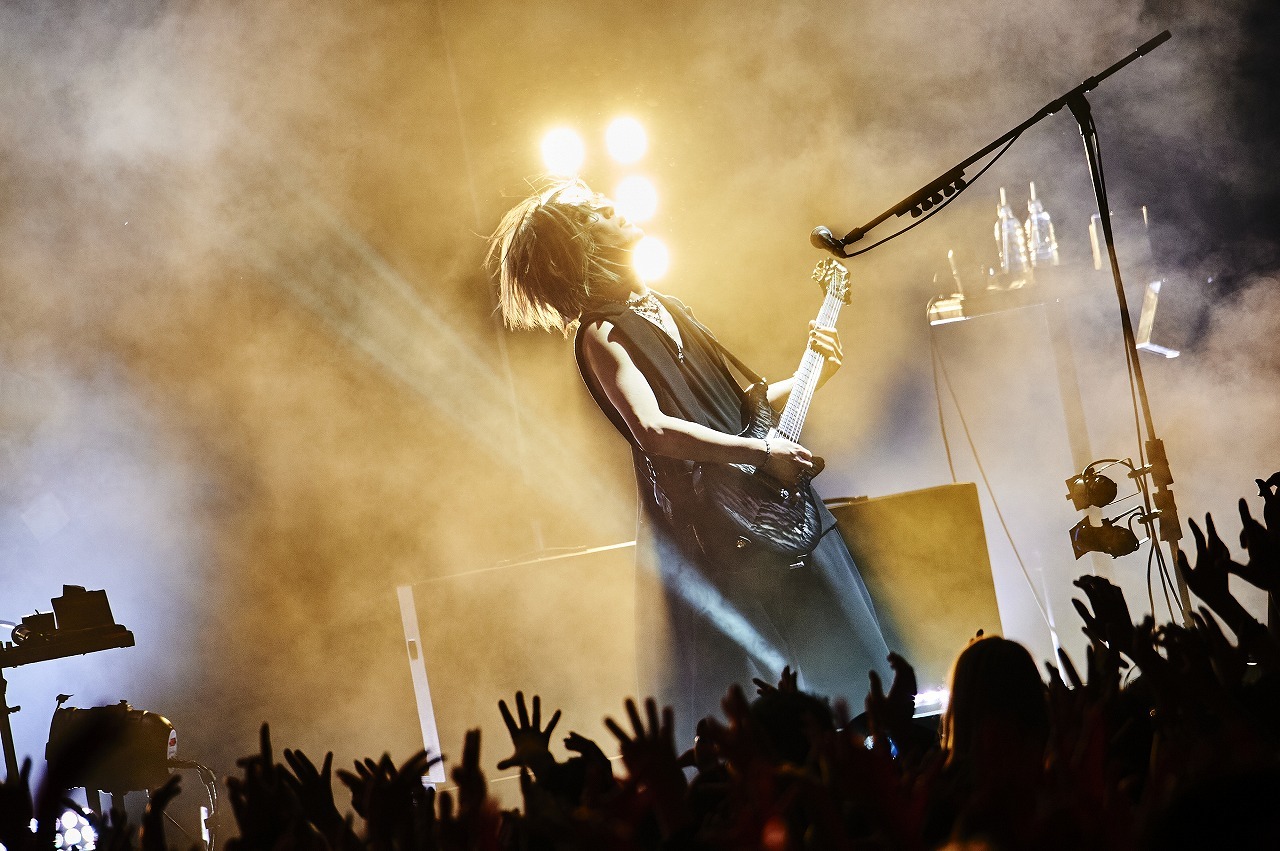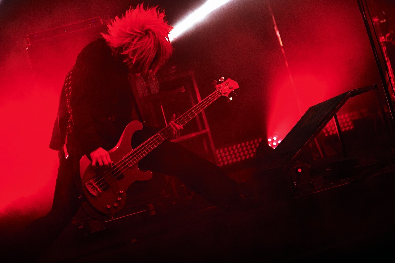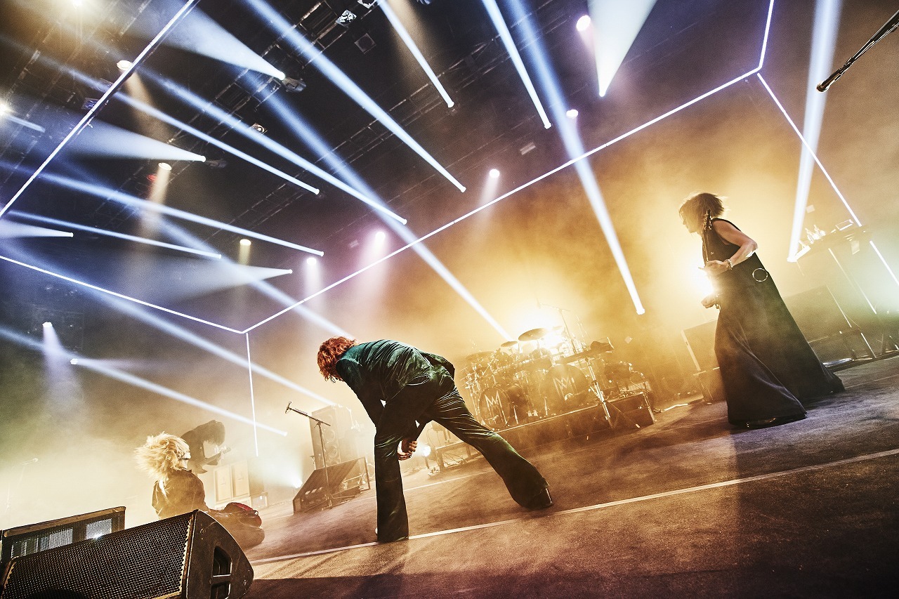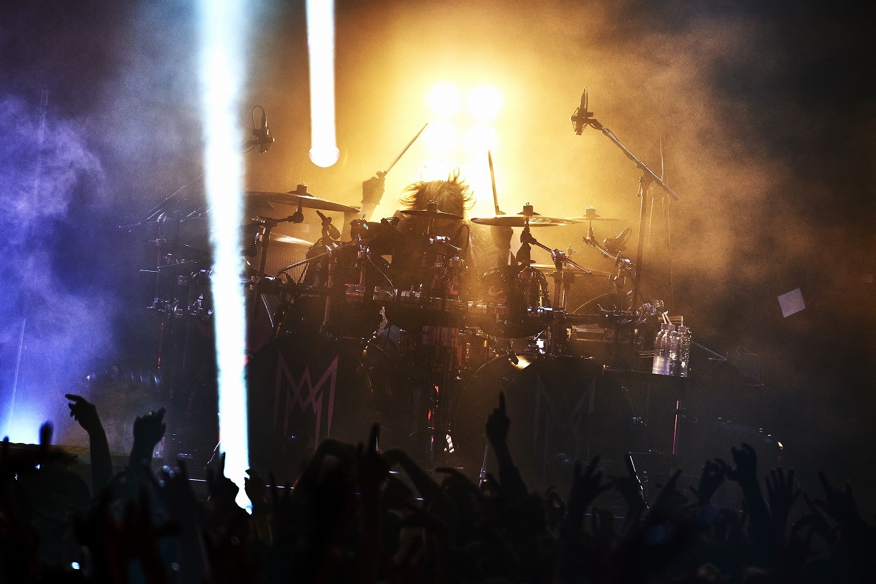 だからこそ「THE SUICIDE CIRCUS」に「DRIPPING INSANITY」と、10年以上前のナンバーで2曲続けてメロウな情緒を描くのには、この日だけの特別感があった。前者ではバンドインする瞬間に右手を上げ、楽曲の世界に入り込んだ葵(Gt)のアグレッシブな動きが目を惹けば、水音からスモークが立ち上り、Mのマークから今度は青いラインが伸びた後者では、青く照らされた舞台に哀しみが充満。腰をかがめて重低音を放つREITA(Ba)、想いの丈をシャウトで吐きだすRUKI、情感の漂うソロを紡ぐ麗(Gt)と、それぞれのプレイも映えて、救いがたい物語を感情的に描き出していく。一転、紅蓮に染まる中でギリギリに抑えたエモーションを聴覚ではなく視覚から届ける「濁」からは、宙に光る星にRUKIが手を伸ばす「THE PALE」、アコースティックギターの音色が心癒す「MOMENT」で観る者の心を浄化。いわゆる『MASS』のバラードパートを担う3曲も、ほぼ毎公演アルバムと同じ並びで披露されることにより、最大の効果を発揮し続けてきたが、それはアルバム制作の時点で彼らがライブのビジョンを正しく見定めていたことの証左に他ならない。そして、その見通しの正しさは、いわゆる“暴れ曲”パートも同様だった。