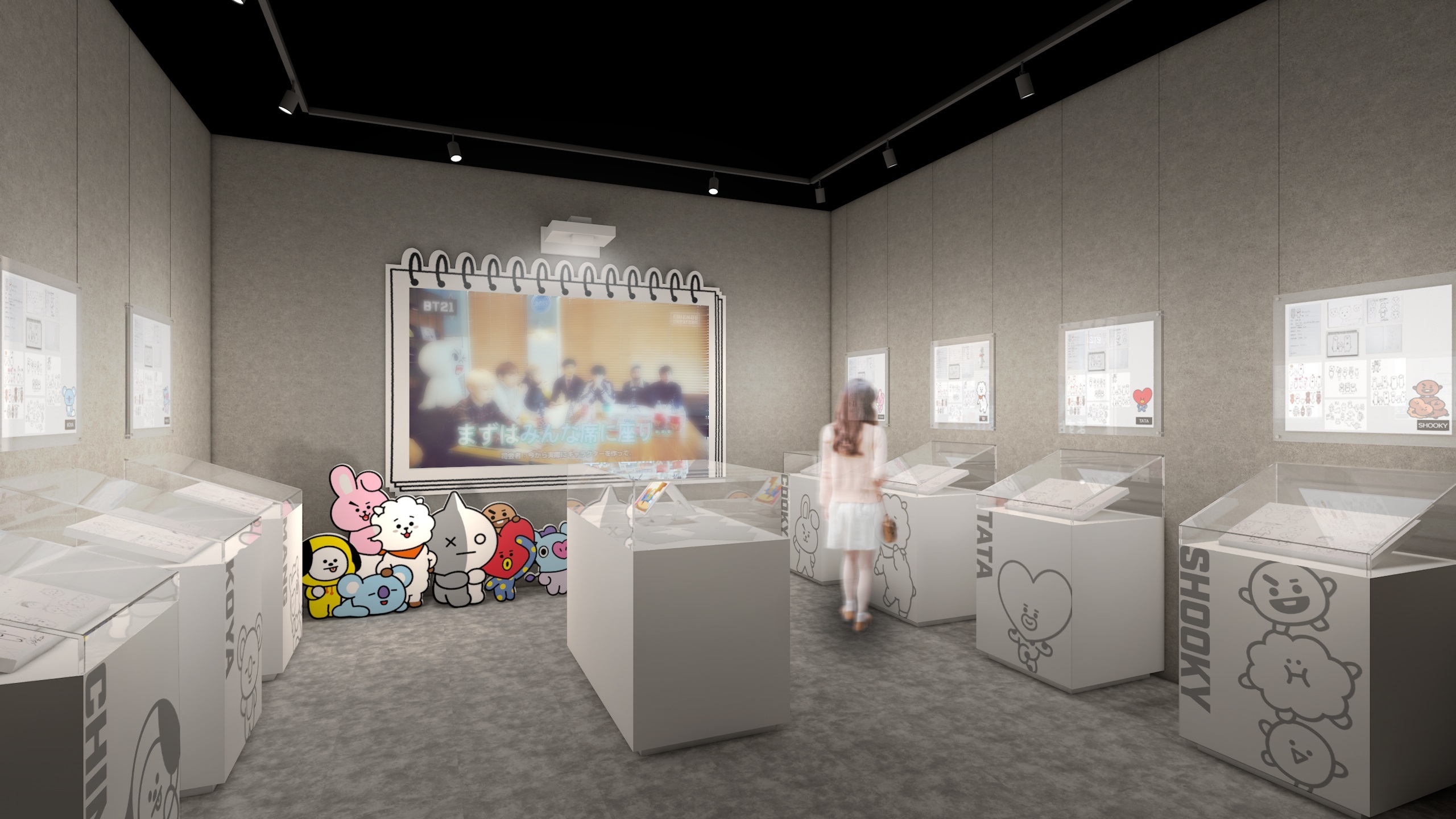 展示エリアには100点以上のアートが集結し、未公開アニメも展開。原画展示エリアでは『BT21』誕生の瞬間の映像と共に、BTSメンバーの作画による貴重なスケッチブック(原画)を展示するほか、BT21の大きなフィギュアも登場する。