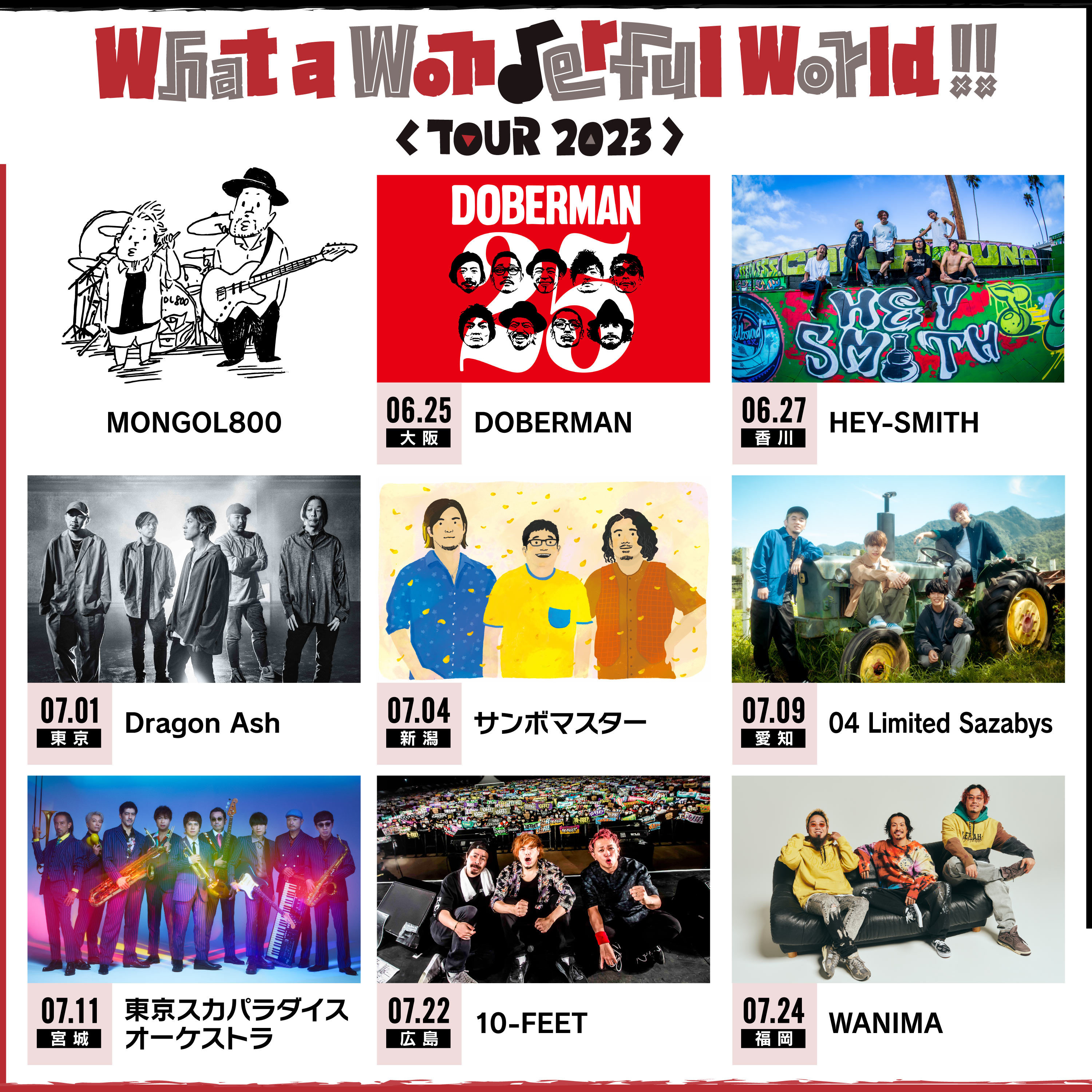 この夏で結成25周年を迎えるMONGOL800が、全国8都市を巡るライブハウス対バンツアー『MONGOL800 25th –What a Wonderful TOUR-2023』( 略して「WWW!! TOUR(ワッターツアー)」)の出演バンドが発表された。