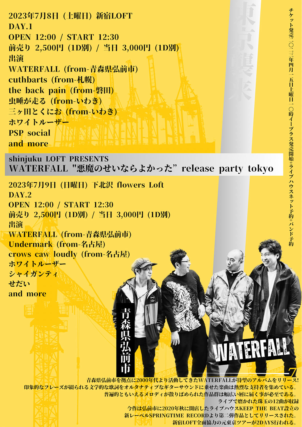 2020年秋、青森県弘前市に開店したライブハウスKEEP THE BEAT設立の新レーベルSPRINGTIME RECORDより、第二弾作品として12曲入りフルアルバム「悪魔のせいならよかった」をリリースしたバンド、WATERFALLの東京公演のレコ初2日間の詳細が発表された。
