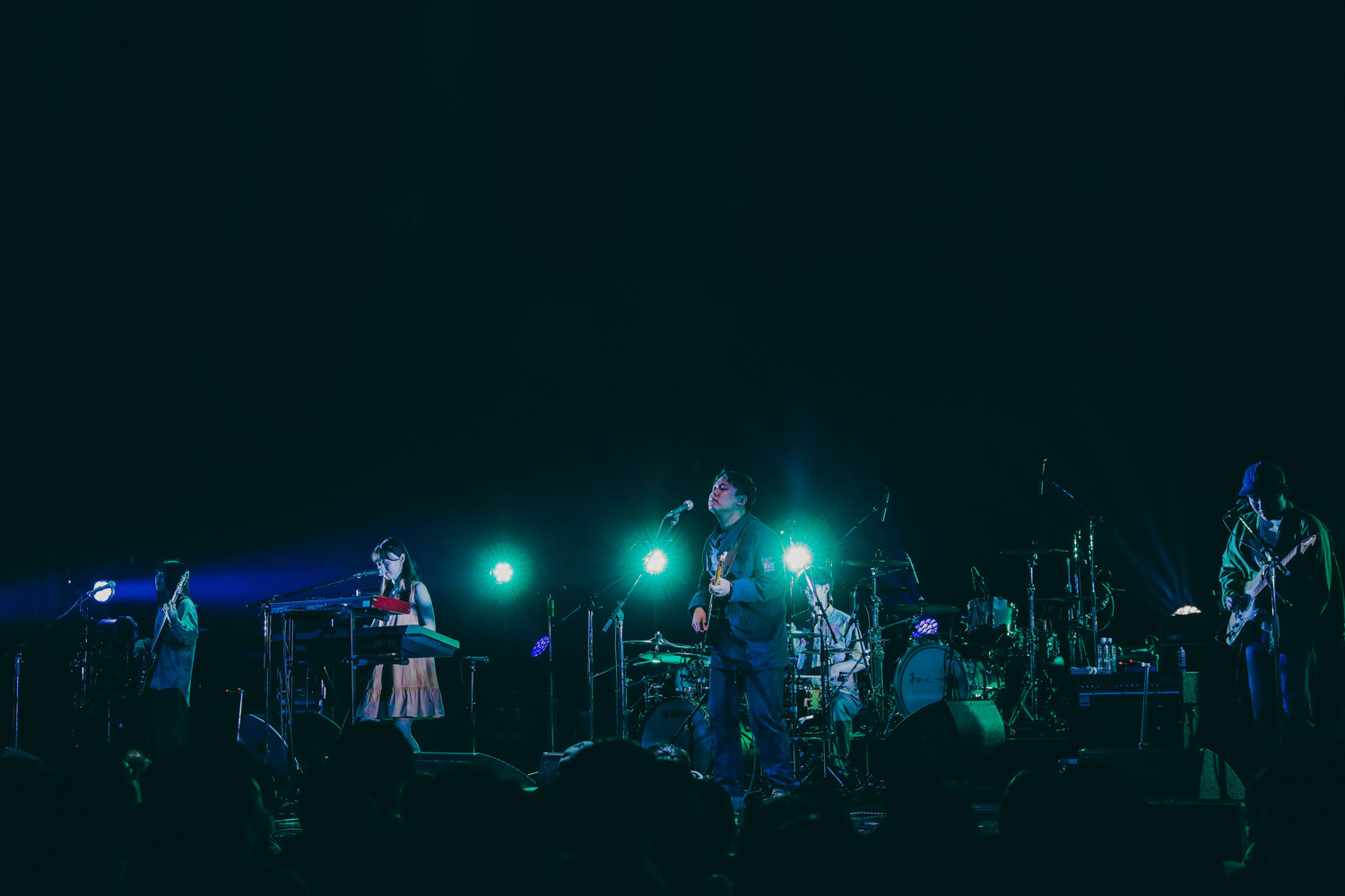 軽やかでスマートなシティーポップ・チューン「冥王星ガール」を歌い奏でた後、「こんなでかい場所でやるのは今回が初めてでテンション上がってます」と、ボーカル&ギターの音山大亮が嬉しそうに話す。さらに音山が続けて、「終わることを表す言葉が、<しめる><おひらき>という真逆過ぎる日本語のパラドックスに最近気づいた」と、謎発見を自慢気に披露。マイペース過ぎるそのMCに、食い入るようにステージを見つめていたフロアも思わず爆笑。