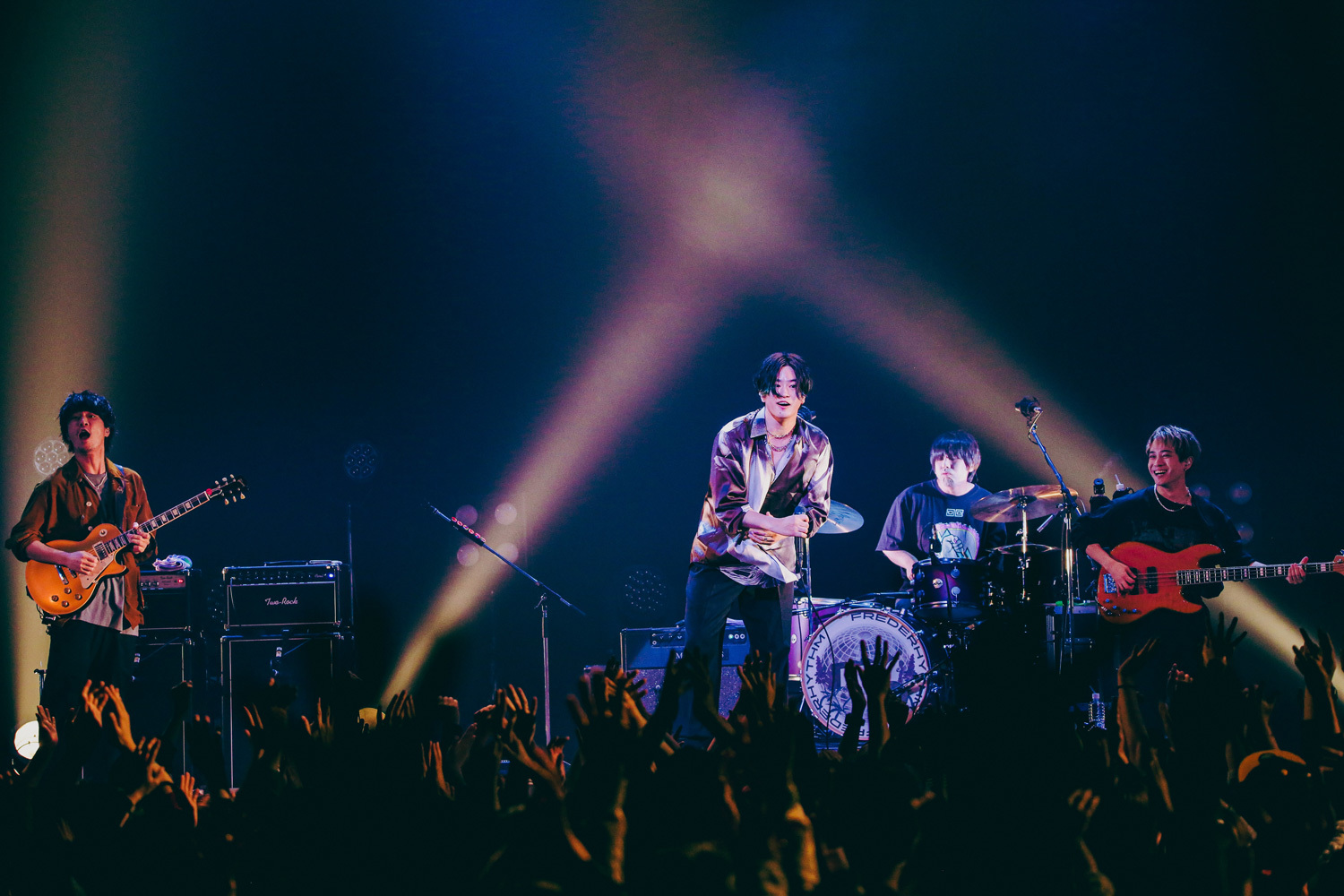 どんな人でもウェルカムなポップ精神と、ライブバンドとしての確固たる自信。4人のプライドが漲るボーカル&ギターの三原健司の一言でスタートしたのは、ライブアンセム「ジャンキー」。早くもダンスホール状態の場内に追い討ちをかけるように、三原健司いわく「フレデリックの2023年の代表曲」という、「スパークルダンサー」を投下。ダンサブルなポップロックチューンの連発に、観客も楽しそうにジャンプとダンスで応えている。