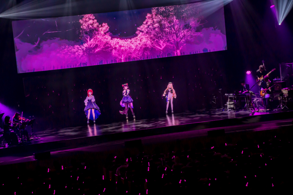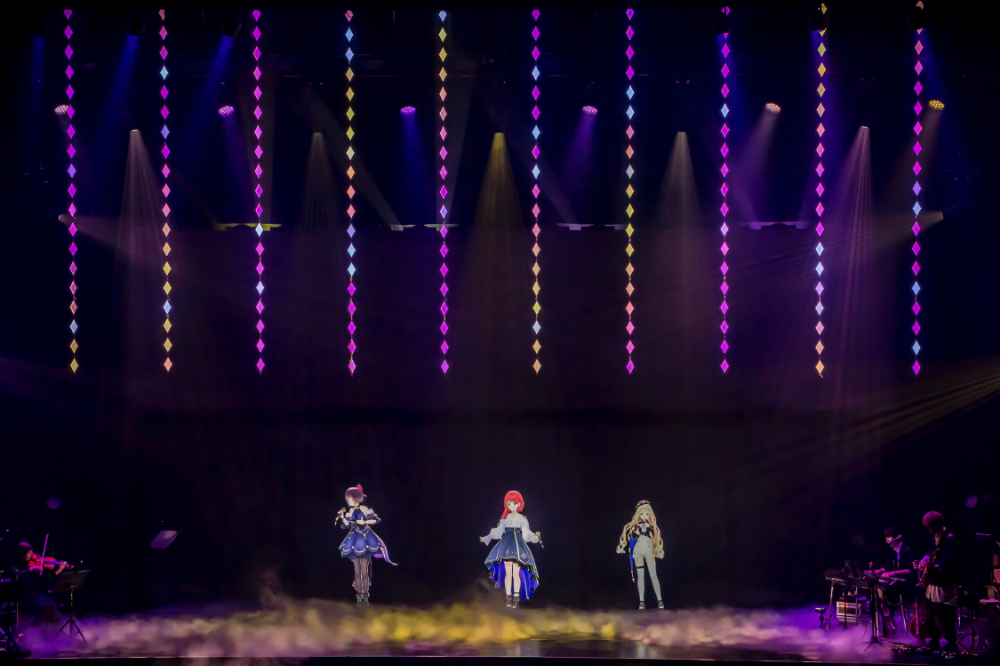 ギターやドラムスに加え、ヴィオラやバイオリンといったストリングス隊までもが並ぶ、豪華な生バンドの演奏で全編進んでいった。そんなストリングスの儚い音色が聞こえてくると、暗闇の中から青白くバンド隊の面々が照らし出されてきた。ベース、ドラムと音が重ねるにつれて重厚感が増していく中で、そのまま1曲目の『Abyssal Zone』へ突入する。バント隊の音の厚みに加え、クライマックスにつれて3人による主旋律と副旋律の掛け合いは緊張感を増していき、荘厳なライブの始まりを告げる鐘の音のような役割を果たしていた。曲の雰囲気はもちろんだが、何より3人の歌唱力を全面に出したこの曲から始まったことが、今夜の行く末を指し示していた。